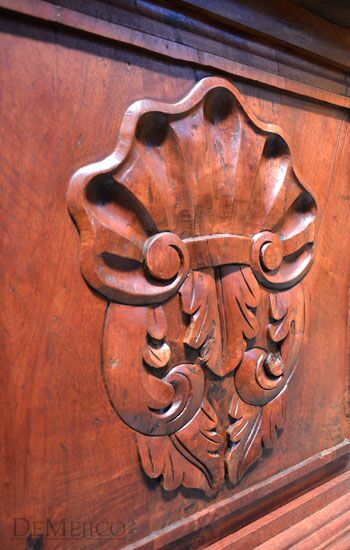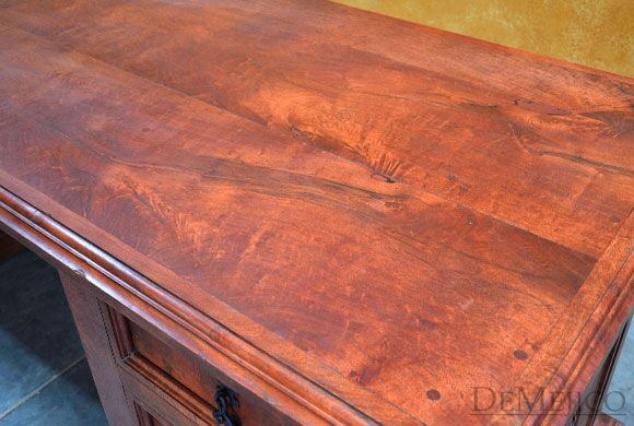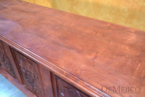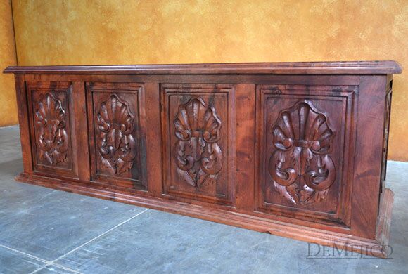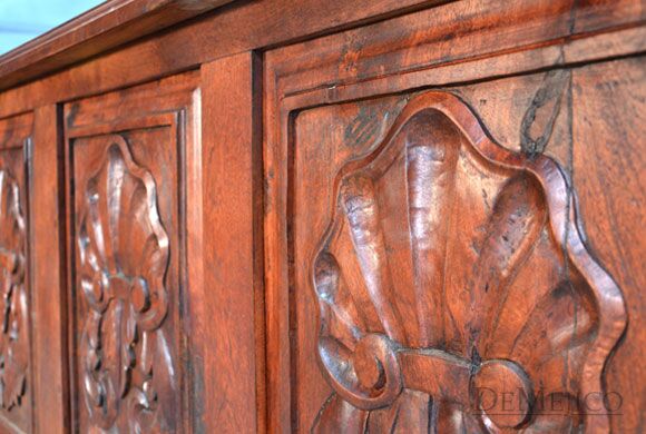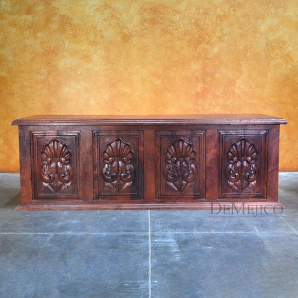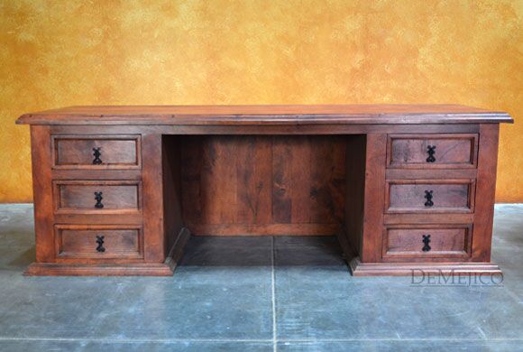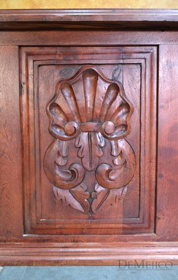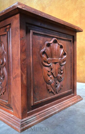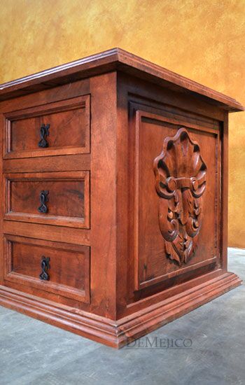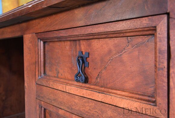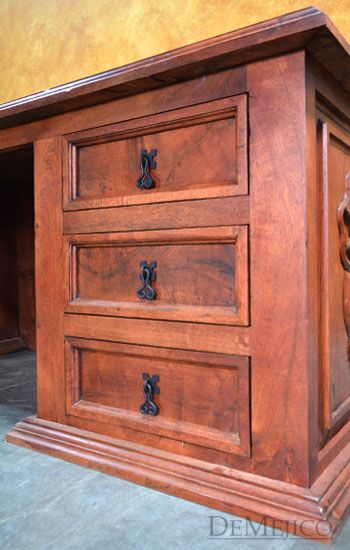 Custom designed for a large office space, our Large Concha Desk is a Spanish desk that takes inspiration from our popular Concha style. Made from solid mesquite wood, this beauty features a traditional Spanish carving as the facing’s focal point as well as on the sides. A smooth top enhances the natural movements of the wood, while providing a solid and large workspace. The backside of this Spanish desk features six drawers for storage.