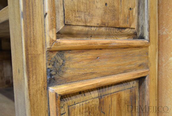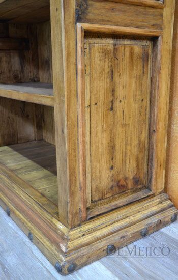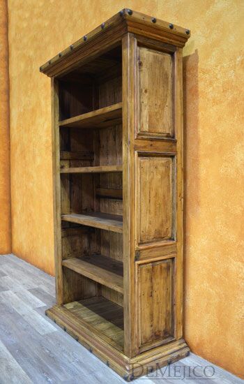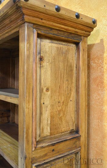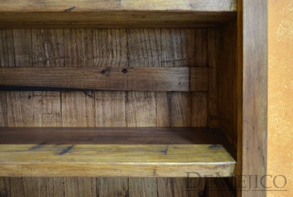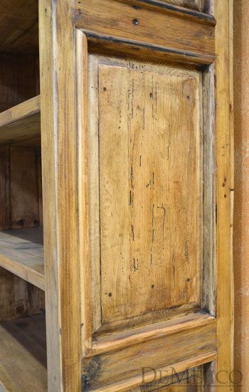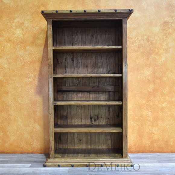 The Hacienda Bookcase is a large bookcase made from solid reclaimed wood. Featuring three raised panels on each side, this rustic bookcase beautifully showcases the natural knots, stretches, and movements of the wood. Paired with hand pounded iron clavos that run along the top and bottom edges, this bookcase beautifully showcases an authentic Spanish look. Four large shelves give the Hacienda Spanish Bookcase just enough space for both storage and/or display, perfect for any medium to large sized office or library space.