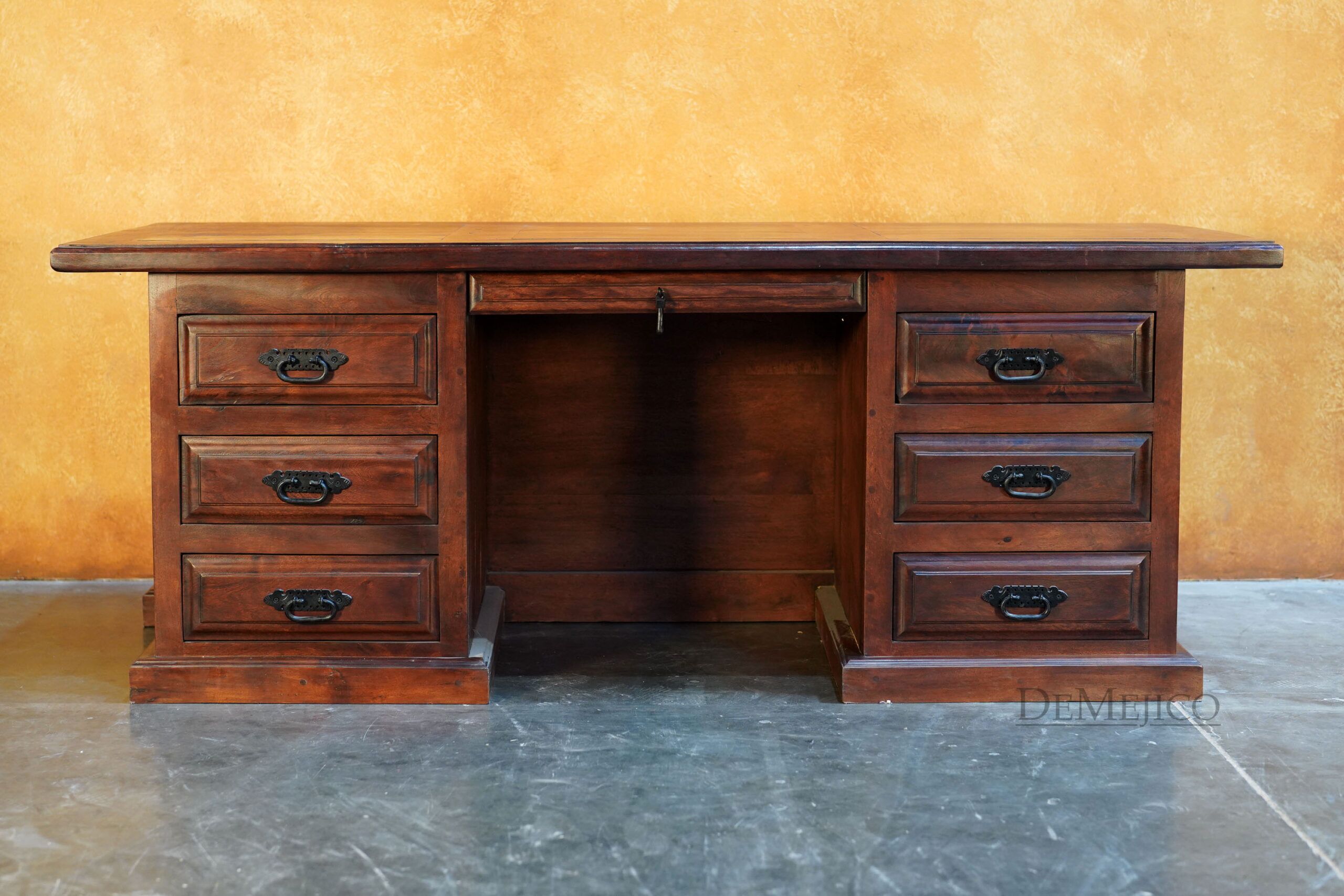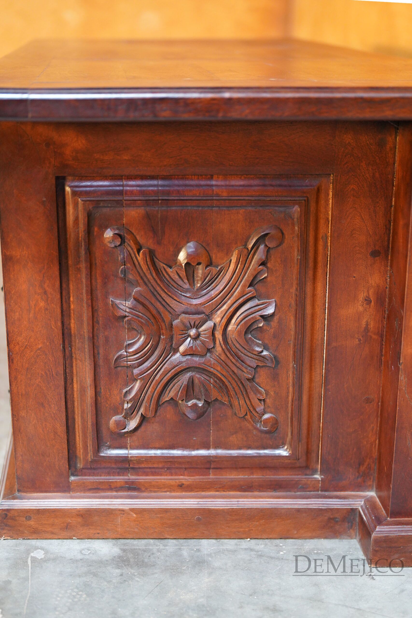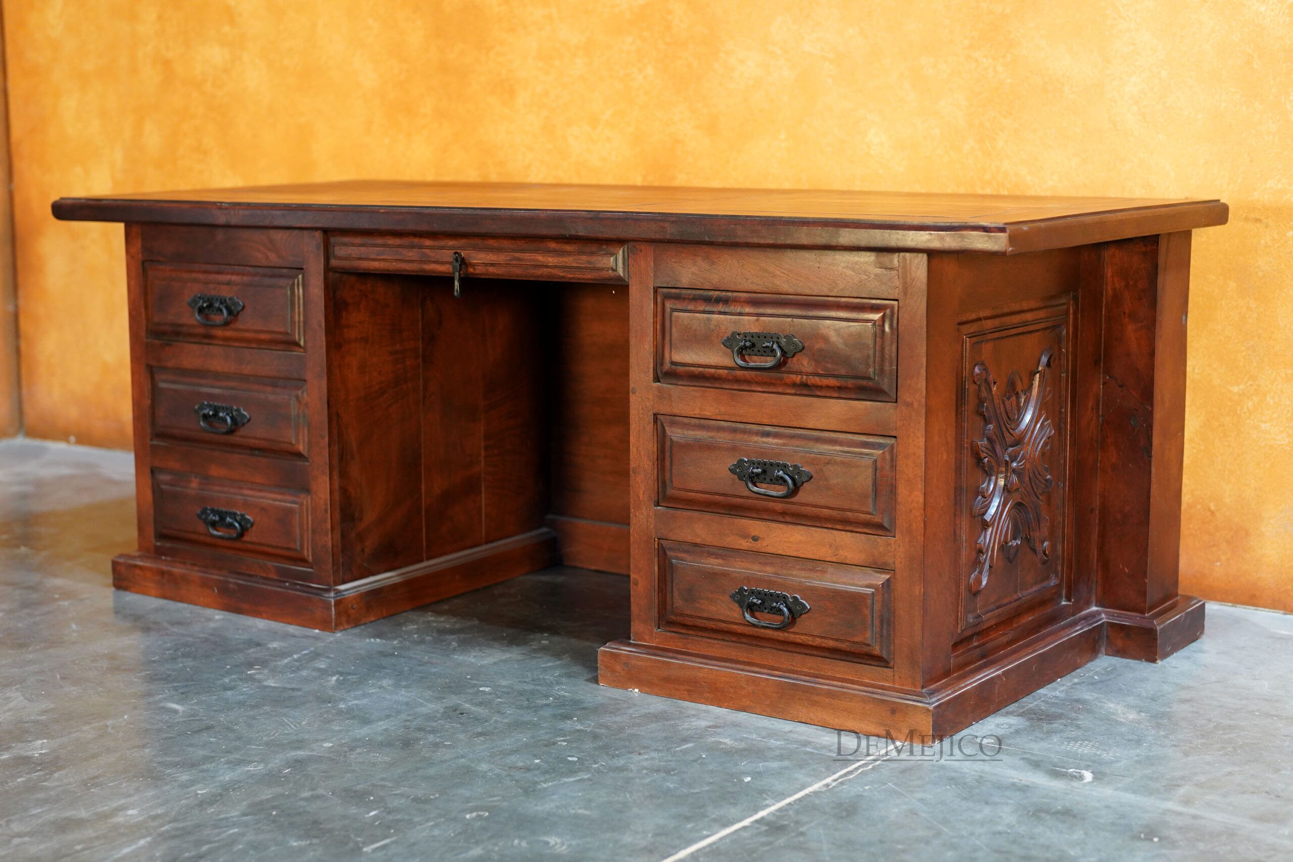 Custom designed for a large office space, our Large Luis Quince Desk is a Spanish Colonial desk that takes inspiration from our popular Luis Quince style. Made from solid mesquite wood, this beauty features a traditional Spanish carving as the facing’s focal point as well as on the sides. A smooth top enhances the natural movements of the wood, while providing a solid and large workspace. The backside of this Spanish desk features six drawers for storage along with a thin drawer for your laptop or computer keyboard.