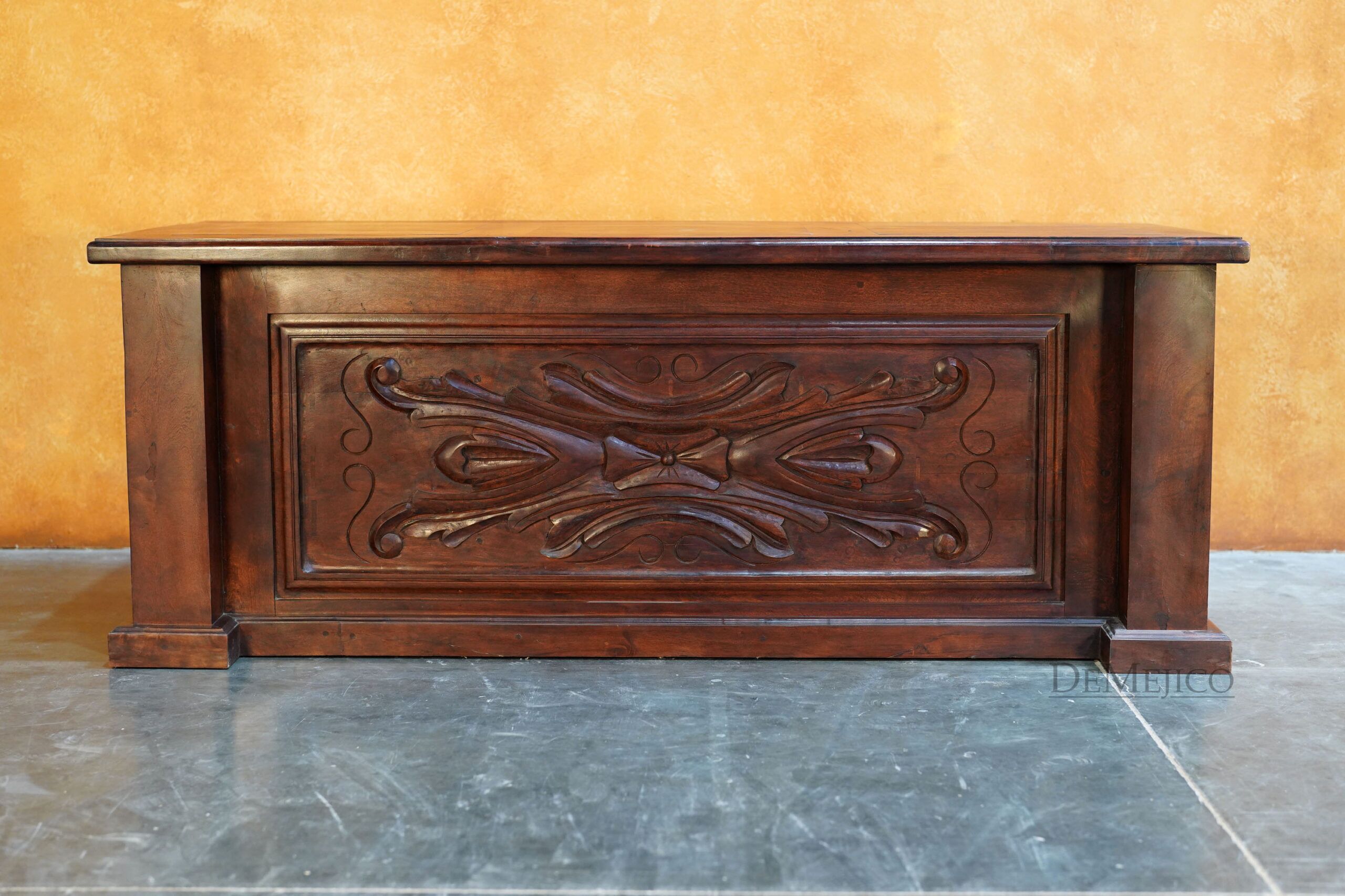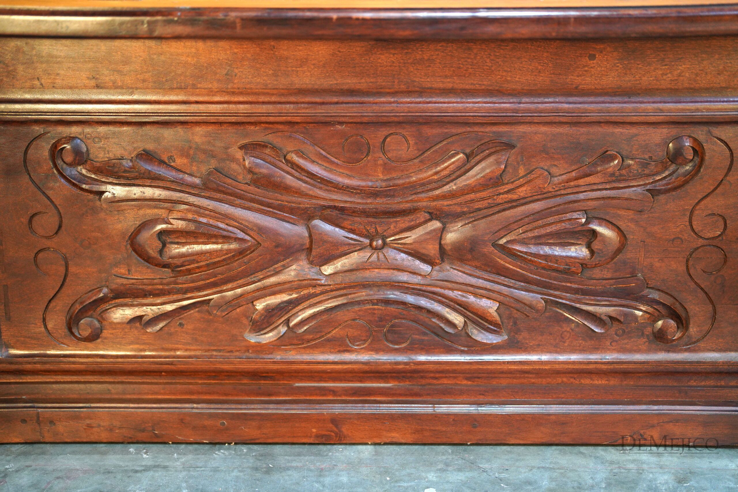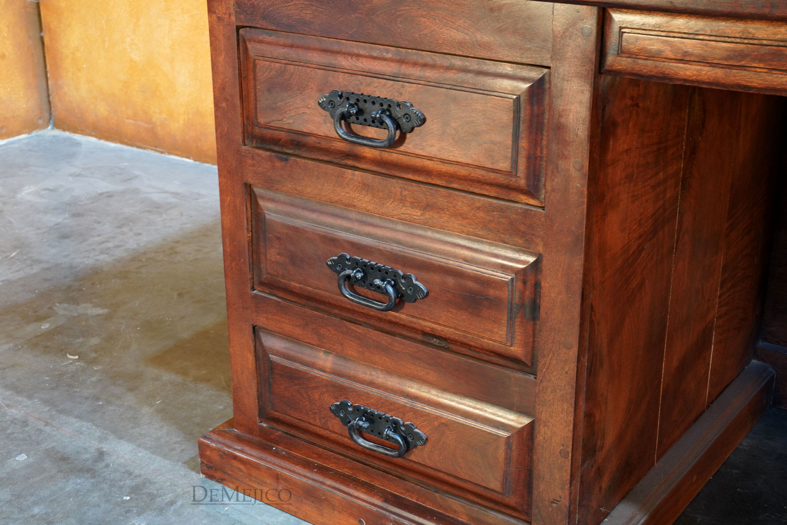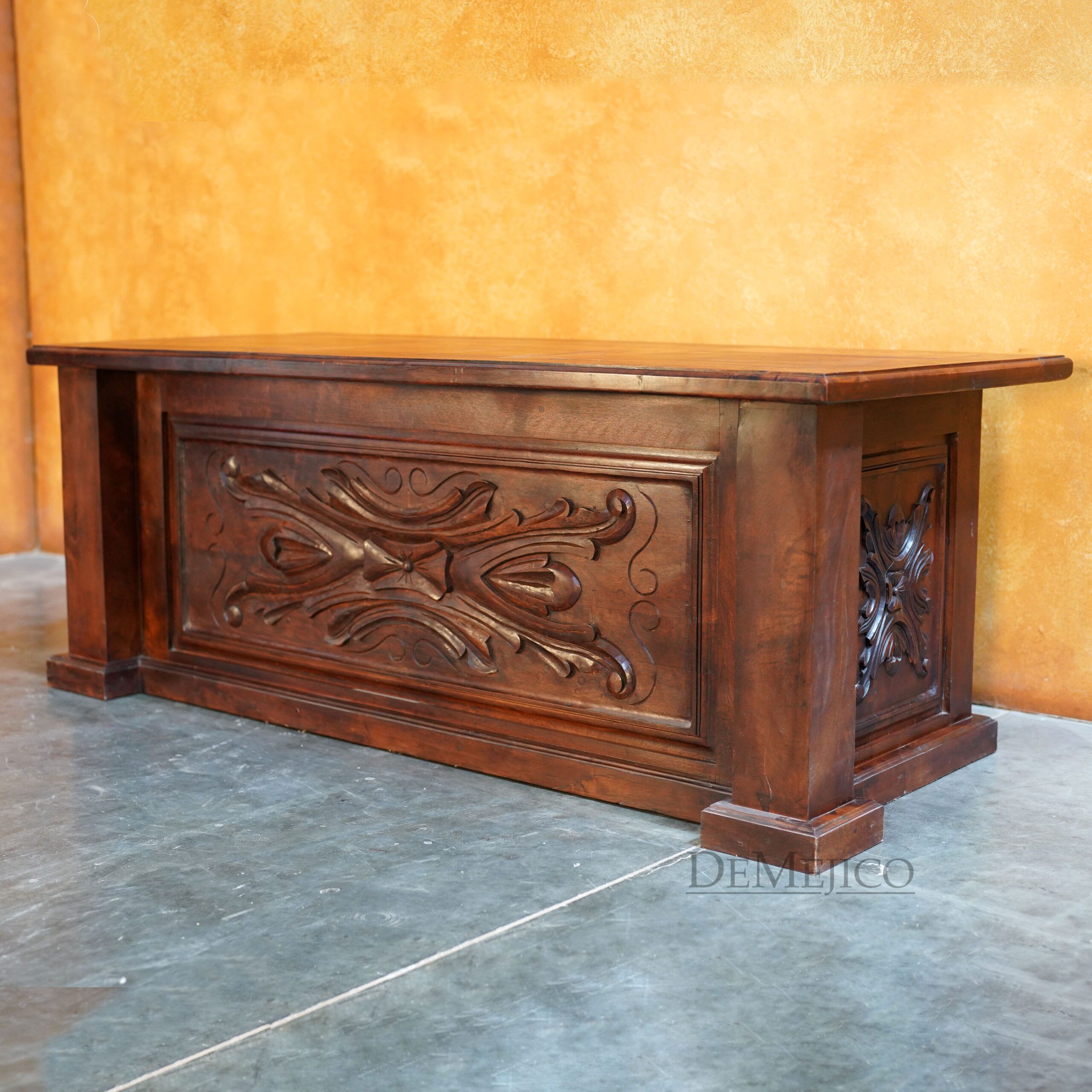 Custom designed for a large office space, our Large Luis Quince Desk is a Spanish Colonial desk that takes inspiration from our popular Luis Quince style. Made from solid mesquite wood, this beauty features a traditional Spanish carving as the facing’s focal point as well as on the sides. A smooth top enhances the natural movements of the wood, while providing a solid and large workspace. The backside of this Spanish desk features six drawers for storage along with a thin drawer for your laptop or computer keyboard.