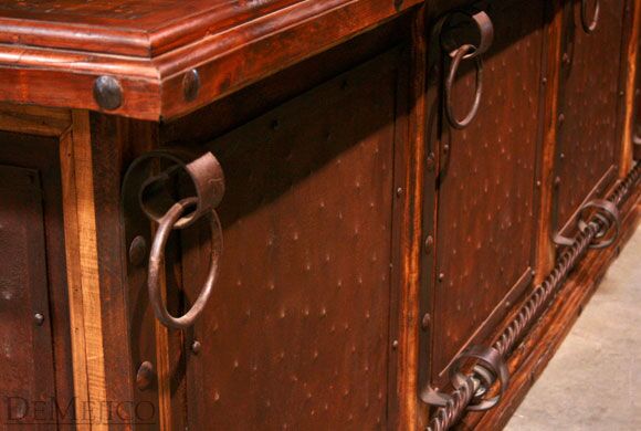 The Large Tequila copper panel bar is made from solid old wood, and features large hand pounded copper paneling across the front side. The top of this bar showcases the natural stretches and imperfections of the wood, and compliments the texture that comes from the hand pounded copper panels. Finished off with hand pounded clavos and hand forged iron rings and twisted footrest, this copper bar gives off a simple Spanish feel. A matching back piece features many of the same design elements, along with mirrors for that look of extended space.