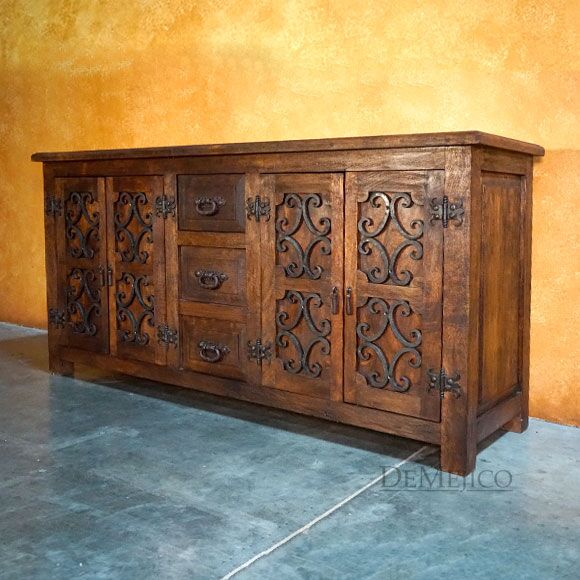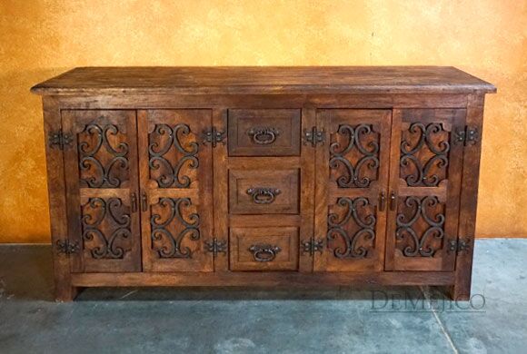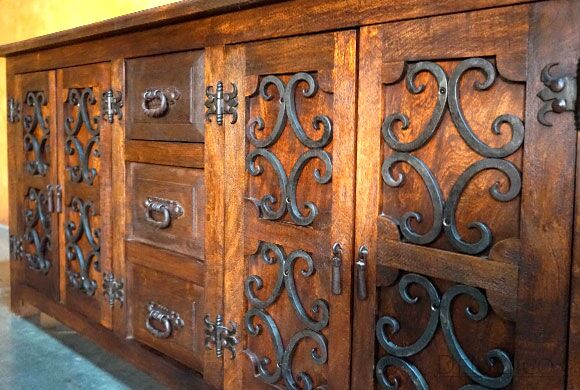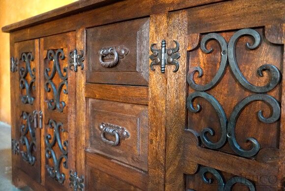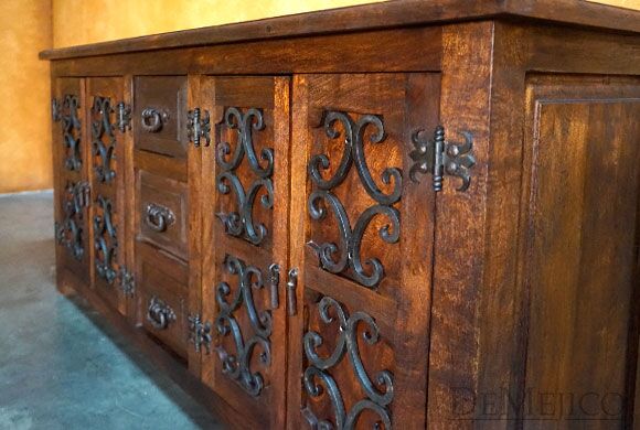 Brand new to our Vanity Catalog, the Large Toluca Vanity is a simple, yet eye-catching Spanish bathroom vanity. Made from solid mesquite wood, this vanity features three center drawers and two double door cabinets, ideal for a double sink set up. Grabbing your attention right away, the double doors feature gorgeous, hand forged iron accents inlayed on four panels. Finished off with hand forged iron hardware and drawer pulls, the Large Toluca Vanity is sure to add a touch of Spanish elegance to your bathroom space.
