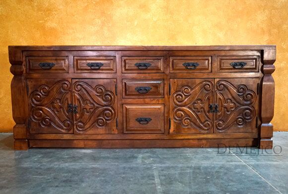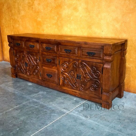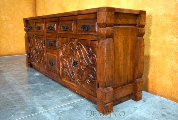 Newly designed, the Las Cruzes Buffet is a beautiful Spanish Colonial Buffet made from solid mesquite wood. Two large, two-door cabinets each featuring hand carved Spanish Colonial designs are the main focal points of this piece. In addition, seven drawers give this hand carved sideboard a great deal of storage space. Accenting these designs are raised panels and forged iron hardware, adding to that classic Spanish look. Finished with carved edge posts on each end, and a stain to enhance the wood and features, this piece is set to impress. Add the Las Cruzes Buffet to the already Spanish style of your home, or, just give your dining or restaurant space a touch of Spanish flair.