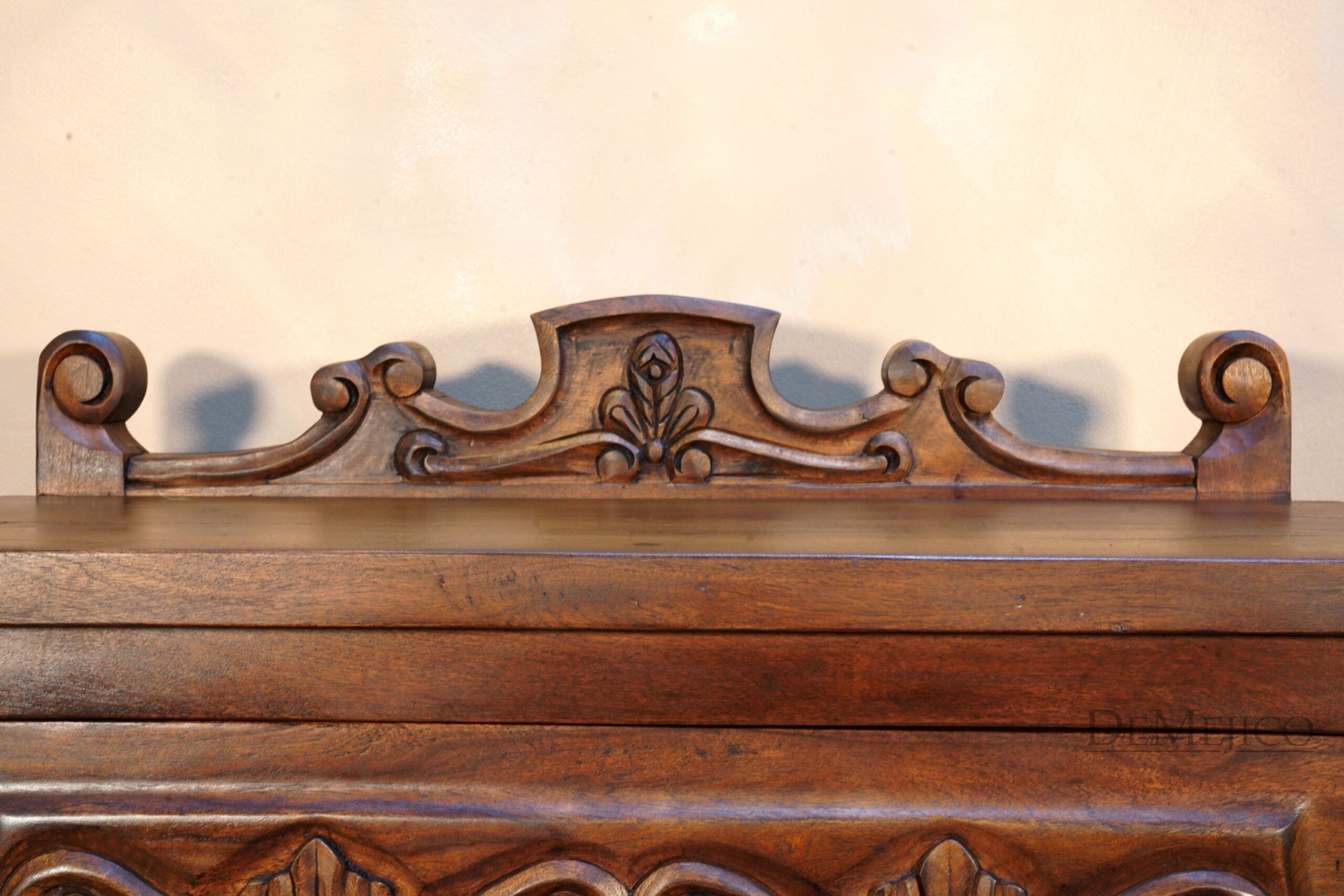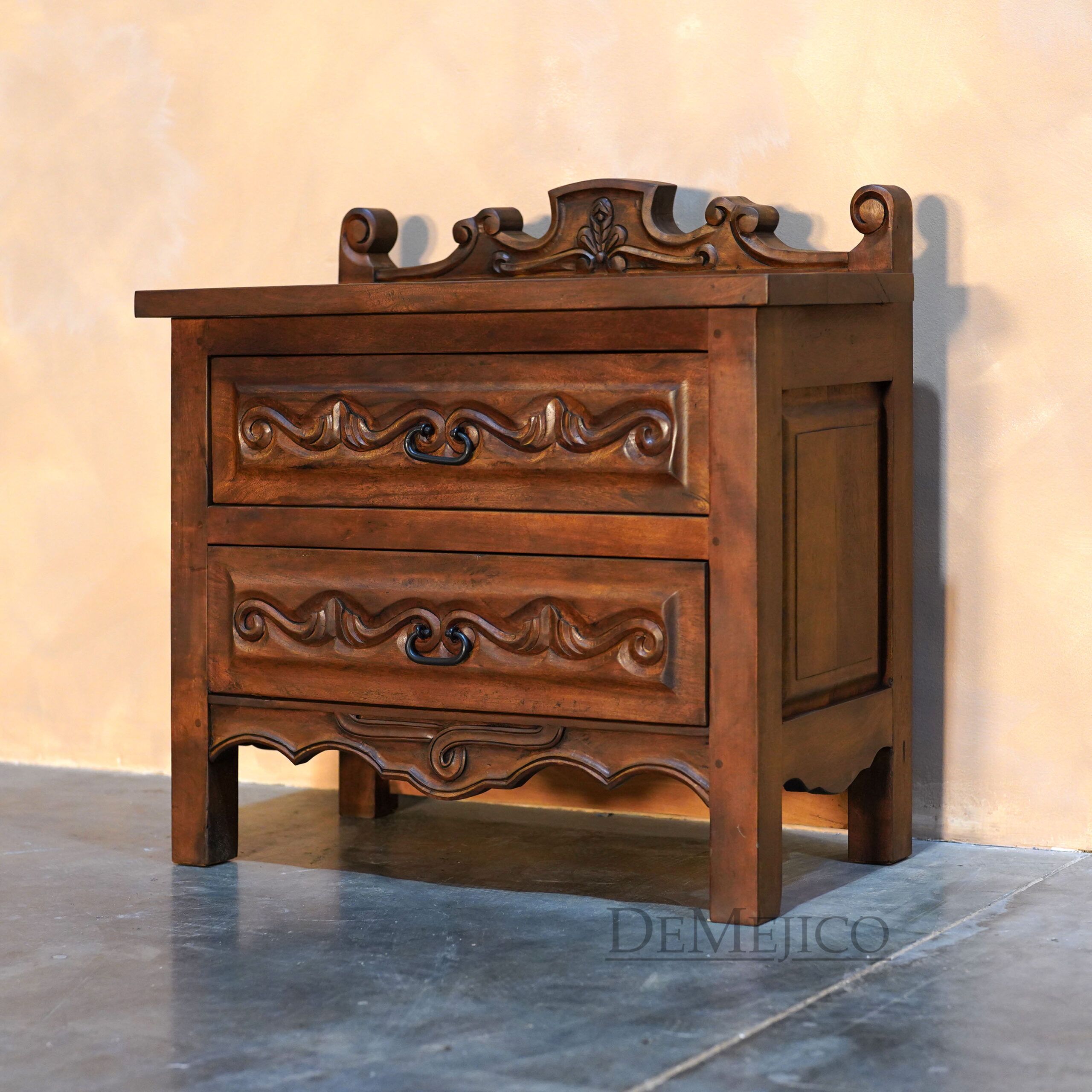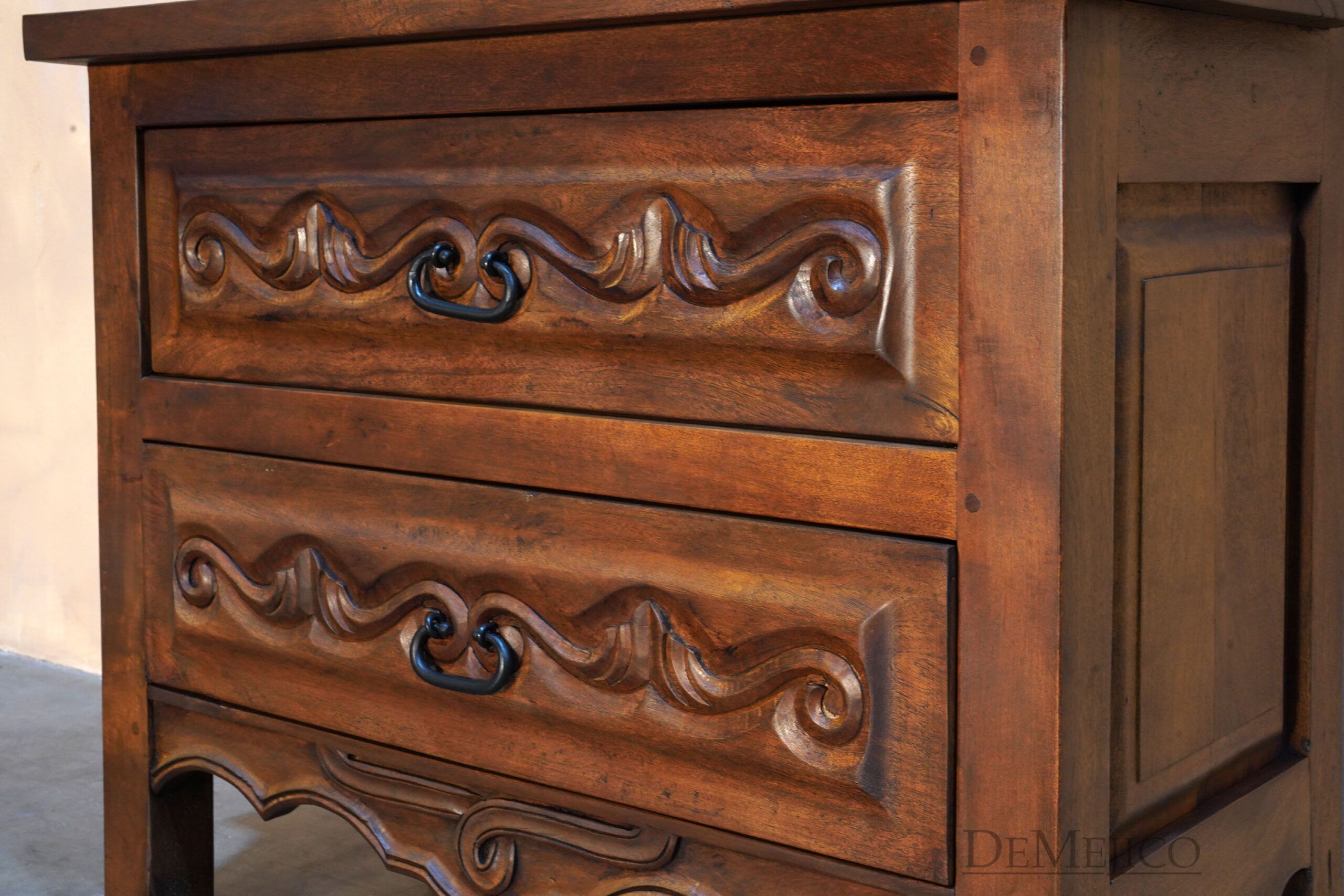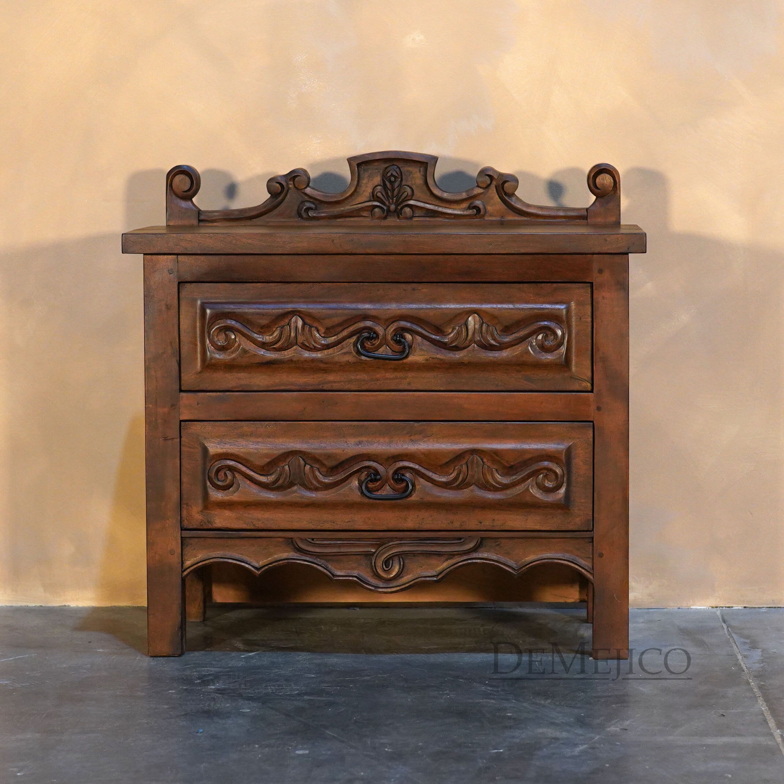 Featured in our Bedroom Catalog, the Light Conquista Dresser Nightstand is an attention-grabbing nightstand, with bold design elements. Hand carved from solid mesquite wood, this Spanish Colonial Nightstand features fleur-de-lis emblems and two raised panel drawers. Finished in a beautiful stain, this hand carved nightstand is fitting for any Spanish Colonial style bedroom or home.