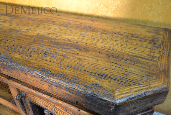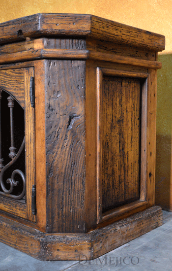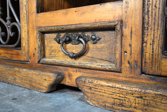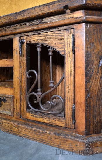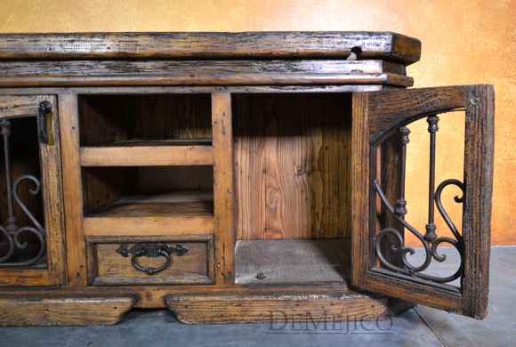 The Lucia TV Stand is a classically designed, Old World entertainment center. Custom built from solid old wood, this piece showcases the natural stretches and movements of the wood along the smooth top and throughout the rest of the piece. Grabbing your attention, two cabinets sit on the left and right sides, and feature hand forged ironwork that almost gives the illusion of an arch within the piece. Two shelving spaces and a single raised panel drawer sit in between these doors, for even more storage space. Further enhancing this feel and finishing off the piece, hand forged wrought iron hardware adorns the cabinets and drawer.