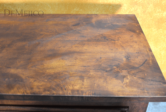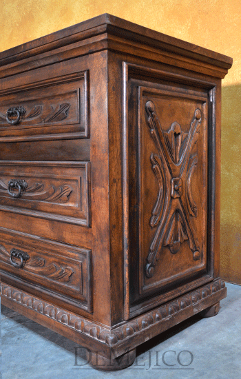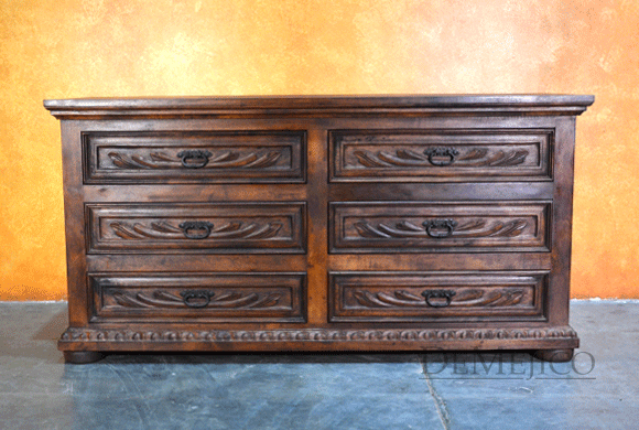 The Luis Quince Dresser is a new and freshly designed Spanish carved dresser, featured in our Bedroom Catalog. Made from solid mesquite wood, this dresser is finished in a beautiful stain, enhancing the natural knots, stretches, and wood movements. Complementing those natural elements, hand carved panels have been added to the facing of the six drawers on this piece. Finishing off the Luis Quince Dresser, small rounded legs lift this piece slightly above the ground.