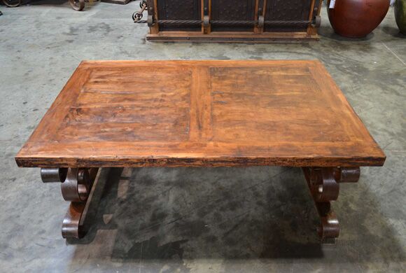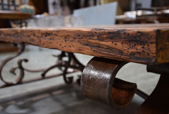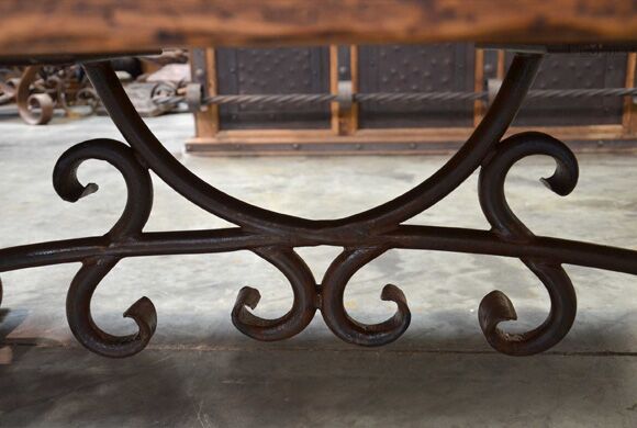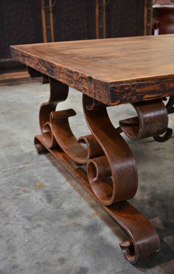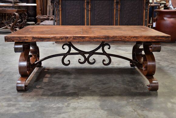 The Mesa de Centro Espanola coffee table is a beautiful wrought iron coffee table carefully crafted from both reclaimed wood and wormwood, featuring a hand-forged base. A smooth top showcases the unique stretches and imperfections of the wood, while being complimented by the natural uneven cut of the table’s edges. The masculine, rustic top and feminine, delicate curves of the base in the Mesa de Centro Espanola come together to make a one-of-a-kind wrought iron coffee table. Balancing between the masculine and feminine features, this piece will add a touch of Spanish decor to your living or entertainment space.