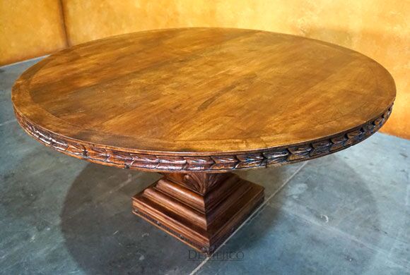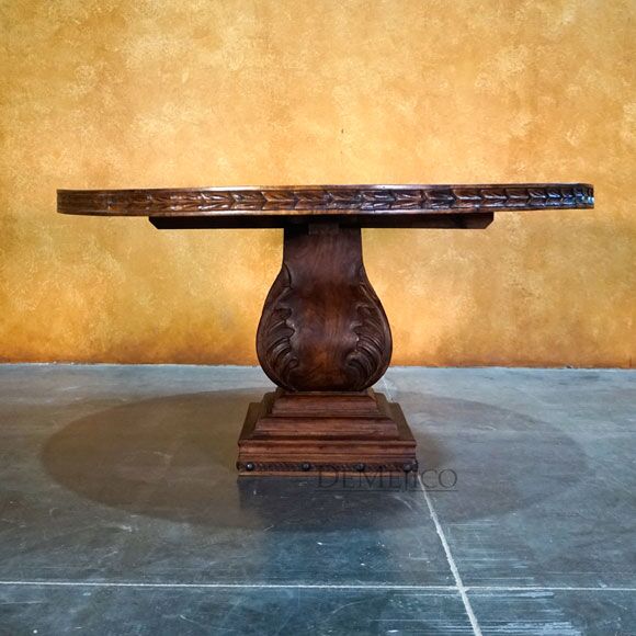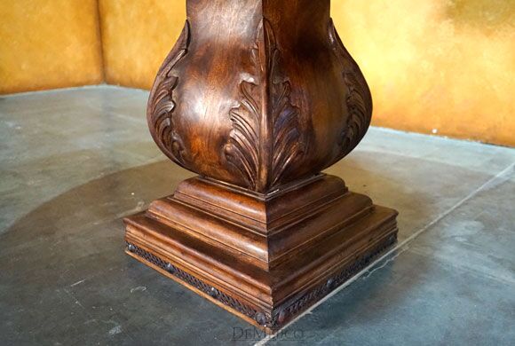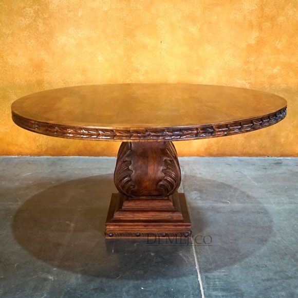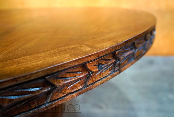 As a beautiful carved round dining table, the Mesa Hoja Carved Table is built from solid aged mesquite wood. Bringing a feminine touch, this table features intricately hand carved details along the edges, as well as on the table’s teardrop style base. The classic Spanish feel of the Mesa Hoja carved dining table is tied together and finished off with woven wire and hand pounded iron clavos along the bottom of the base.
