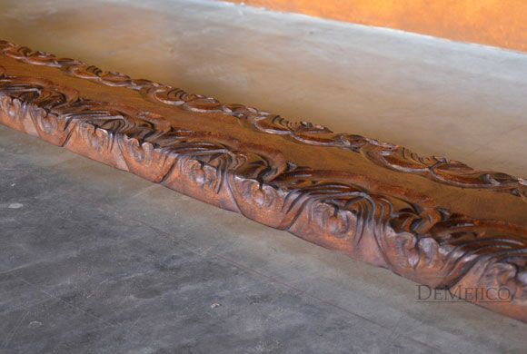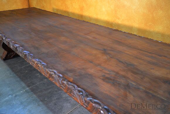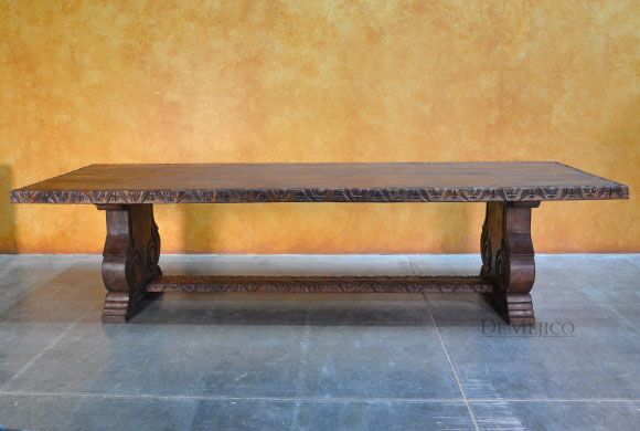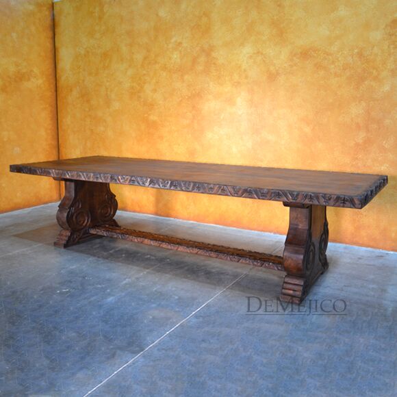 The Mesa Natalia is a stunning Spanish dining table, freshly designed and added to our Dining Catalog. Made from solid aged mesquite wood, this table features a smooth and thick top that showcases the natural knots, stretches and movements of the mesquite wood. Intricately hand carved, the detailing around the table’s edge matches the detailing along the trestle base. Complementing these details, the two legs also feature intricate and bold carved detailing. For an attention grabbing Spanish look, add the Mesa Natalia carved trestle table to any dining or restaurant space.