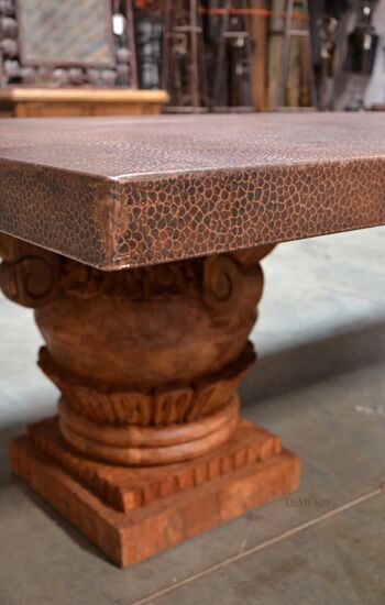 Featured in our Dining Catalog, the Mesa Santa Barbara is a large, 10ft, copper top dining table fit for any grand dining area. The main focal point of this table is the large and unique, hand-pounded copper top, showcasing natural color variations. Featuring intricate details, two hand carved bases made from solid mesquite wood serve as beautiful accents, and allow for ample seating and leg room for your family and guests. Add the Mesa Santa Barbara to any large dining or restaurant space for a unique touch of Spanish style design.