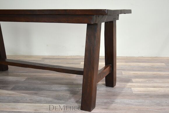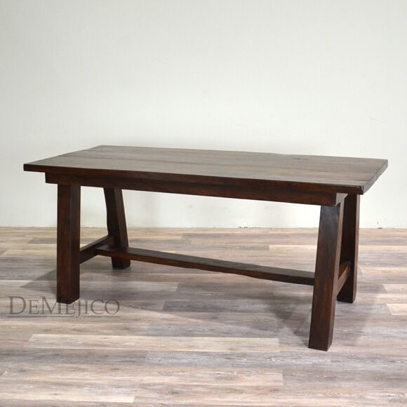 Made from solid mesquite wood, the Mesa Sencilla Especial is a simple wood table featured in our Dining Catalog. This small dining table features a basic, rectangular table top paired with simple legs, each with a slight angle and connected by a trestle base.