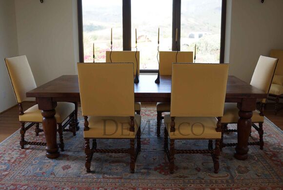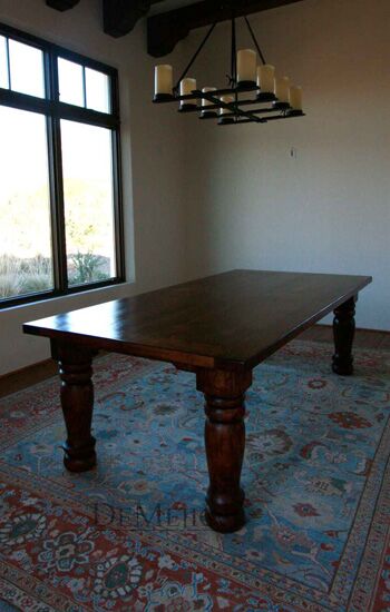 The Mesa Tuscana Turned Leg Dining Table is an elegant dining table featured in our Dining Catalog. Built from solid aged mesquite wood, the top of this table is 2″ thick, and is accentuated by large, hand turned legs. Finished in a dark stain, the Mesa Tuscana is given that final touch of elegance, fit for any grand dining space.