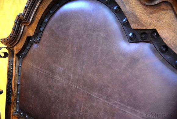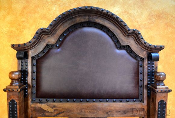 The Mesquite Alamo Bed takes design elements from classic, handcrafted Spanish origins. Being the main focal point of this bed, the headboard is complete with a large hand-dyed leather piece that is smooth to the touch. Complimenting this, are hand pounded iron clavos placed around the leather and along the edges of the arched Alamo style, solid mesquite wood. For an added touch, forged iron scrolls have been added on both sides, and are also accented with clavos. These materials and designs come together to create a breath-taking impression of old Spanish bedrooms.