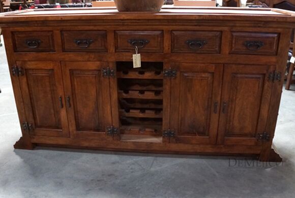 A mesquite carved bar, the Mesquite Chapala Bar is a classically designed Spanish bar featured in our Bar Catalog. Built from solid mesquite wood, this bar features a smooth top, three raised panels on the front, and a beveled edge bottom. Showcasing deep Spanish influences, the three panels on the front of this bar have each been carefully hand carved with authentic Spanish designs. Finishing off the front of this bar, are hand forged wrought iron scrolls and hand pounded iron clavos.
