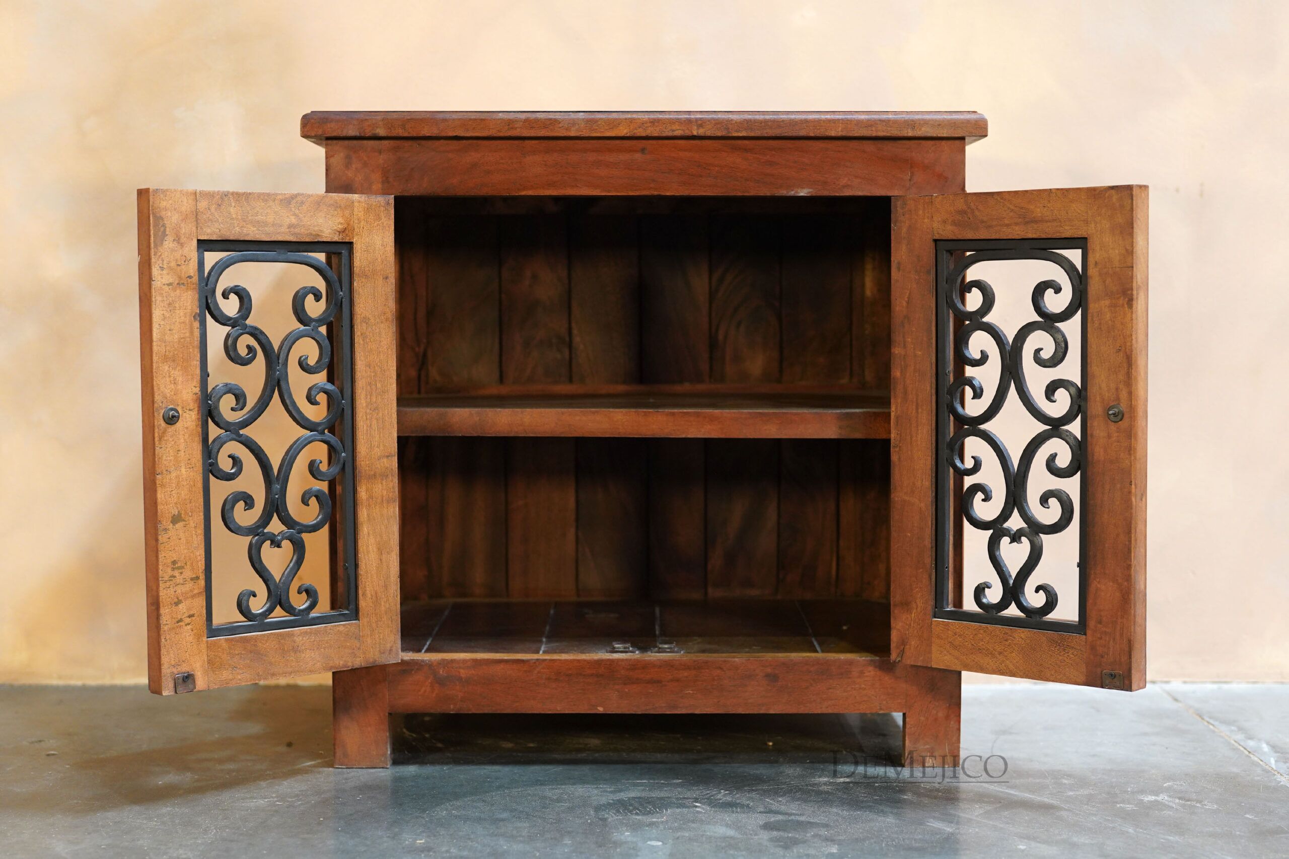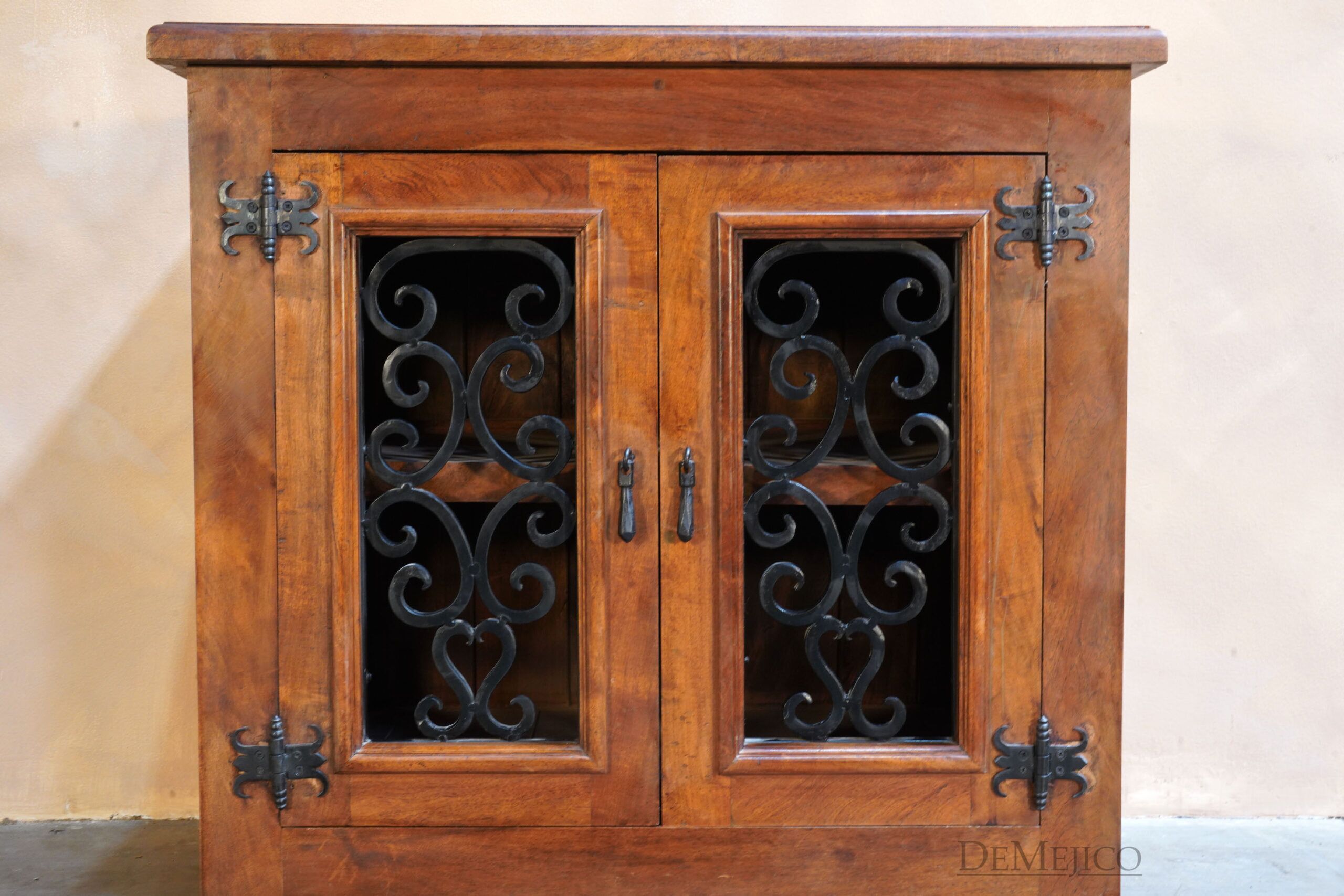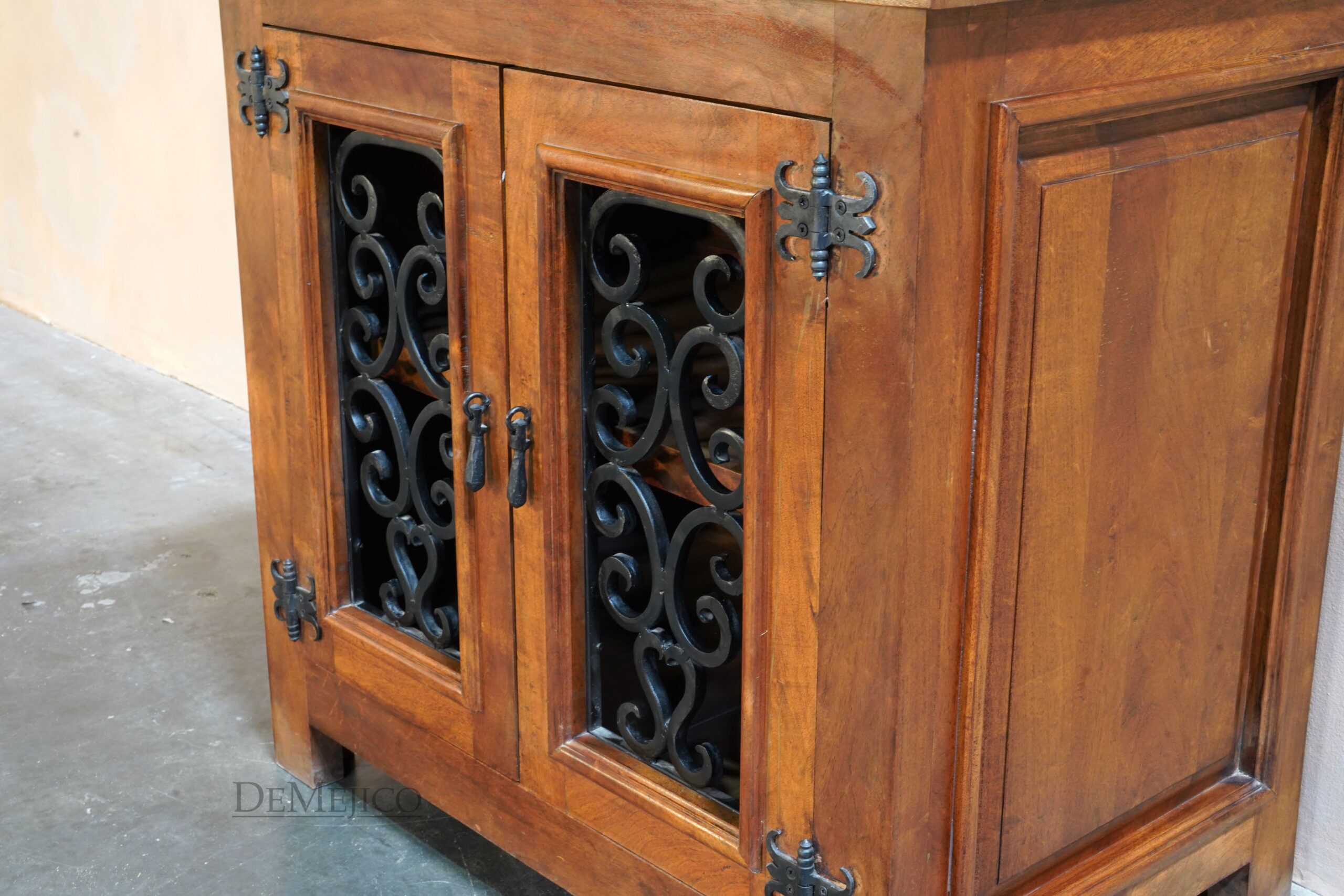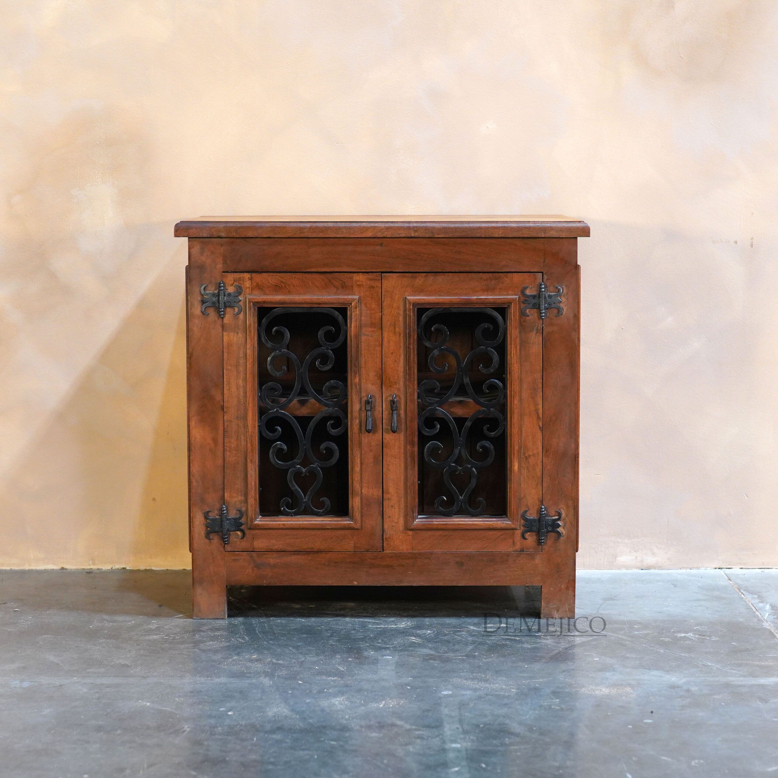 The Mesquite Espanola Vanity is a beautiful addition to our Vanity Catalog, inspired by one of our most popular entertainment center designs. Carefully crafted from mesquite wood, this Spanish vanity features a smooth surface that showcases its natural stretches and knots. Matching the raised paneling on the sides, two raised paneled cabinets on the front are complete with hand forged iron hardware panels. Opening up to a single shelf inside, this vanity has just enough storage space for all of your bathroom needs. Finished off with hand forged iron straps, clavos and pulls, the Mesquite Espanola Vanity is a perfect addition to any Spanish style bathroom space.