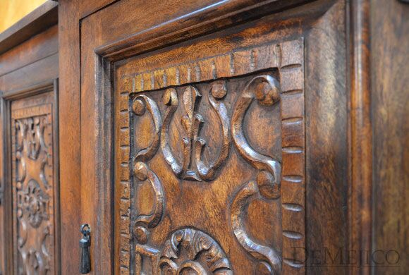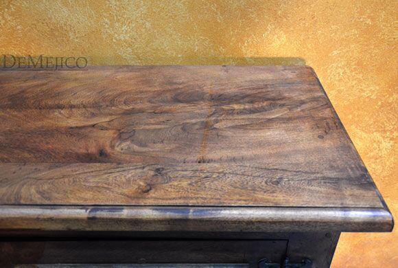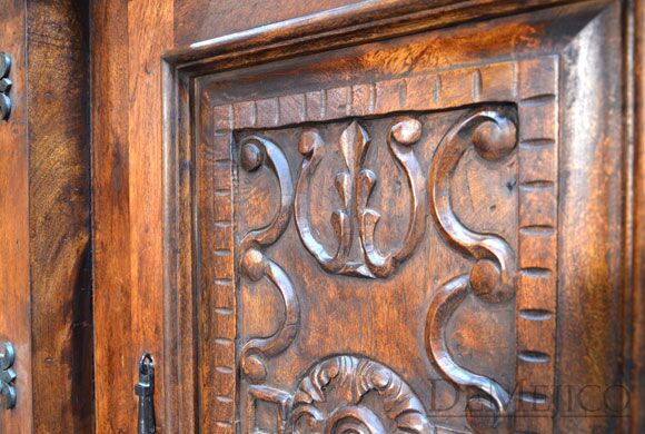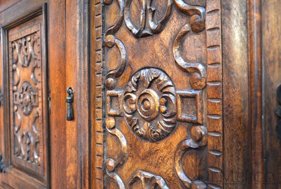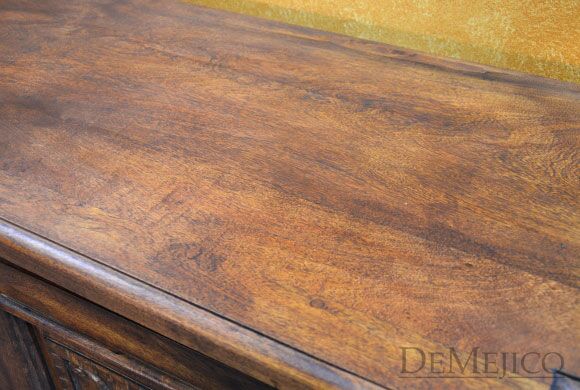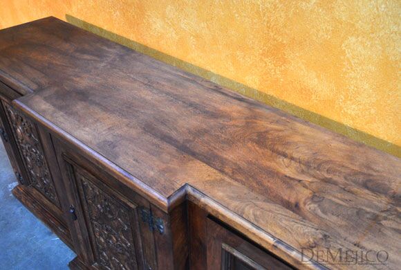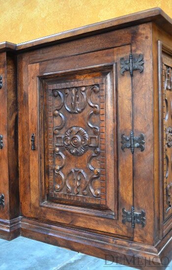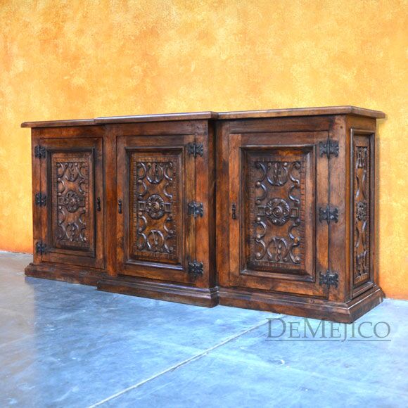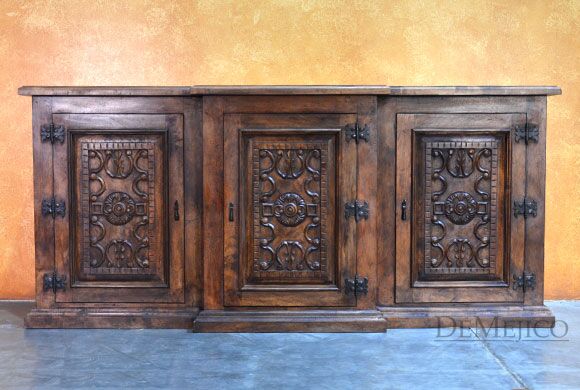 The Mesquite Oaxaca Buffet is a grand piece, brand new to our Dining Room Catalog. Hand crafted from solid mesquite wood, and accented by hand forged iron hardware, this carved buffet features a great deal of Spanish style. Grabbing your attention, three large cabinets each adorned with intricately hand carved detailing are the focal point of this buffet. Finished off with hand forged wrought iron accents and hardware, this Spanish buffet table is the perfect addition to your large dining room or entertainment space.