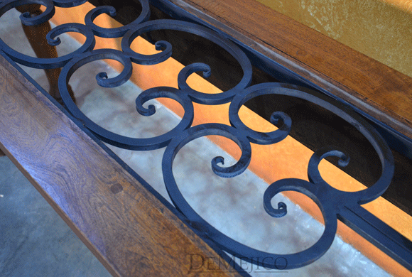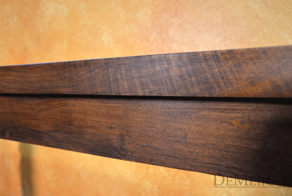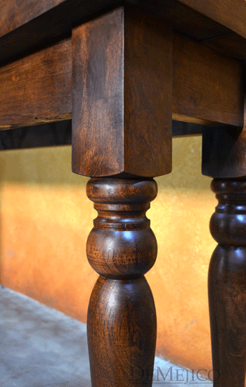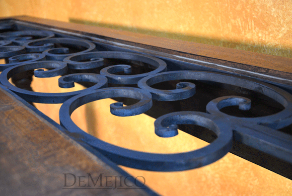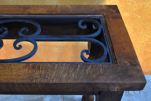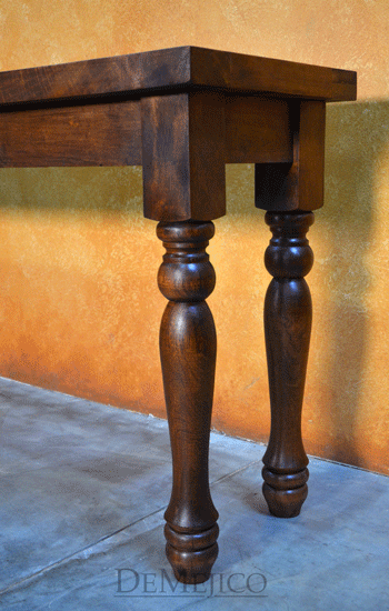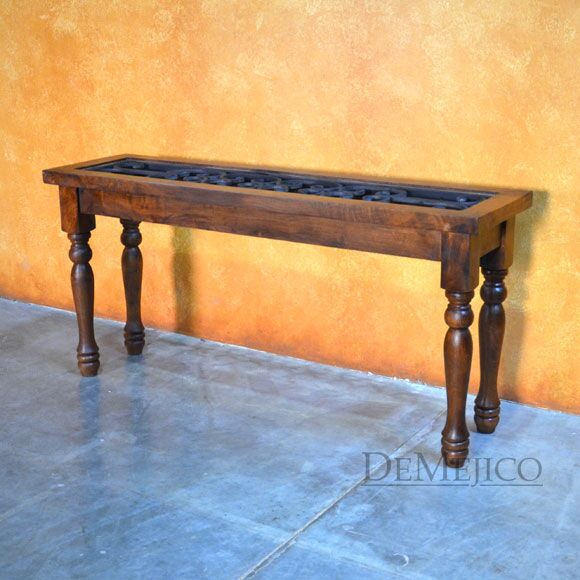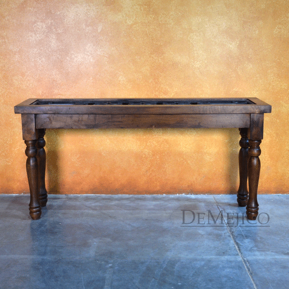The Mesquite Torno Colonial Console Table is a beautiful console table made from solid mesquite wood. The top of this console table features a centered glass panel, showcasing authentic, Spanish scrollwork underneath. The legs have been hand turned, and subtly highlight the natural stretches, grains, and movements of the wood.