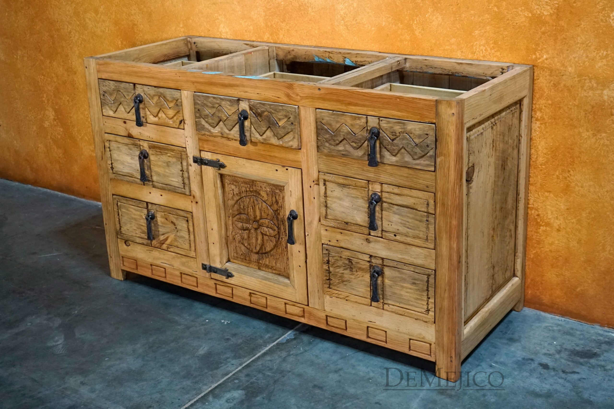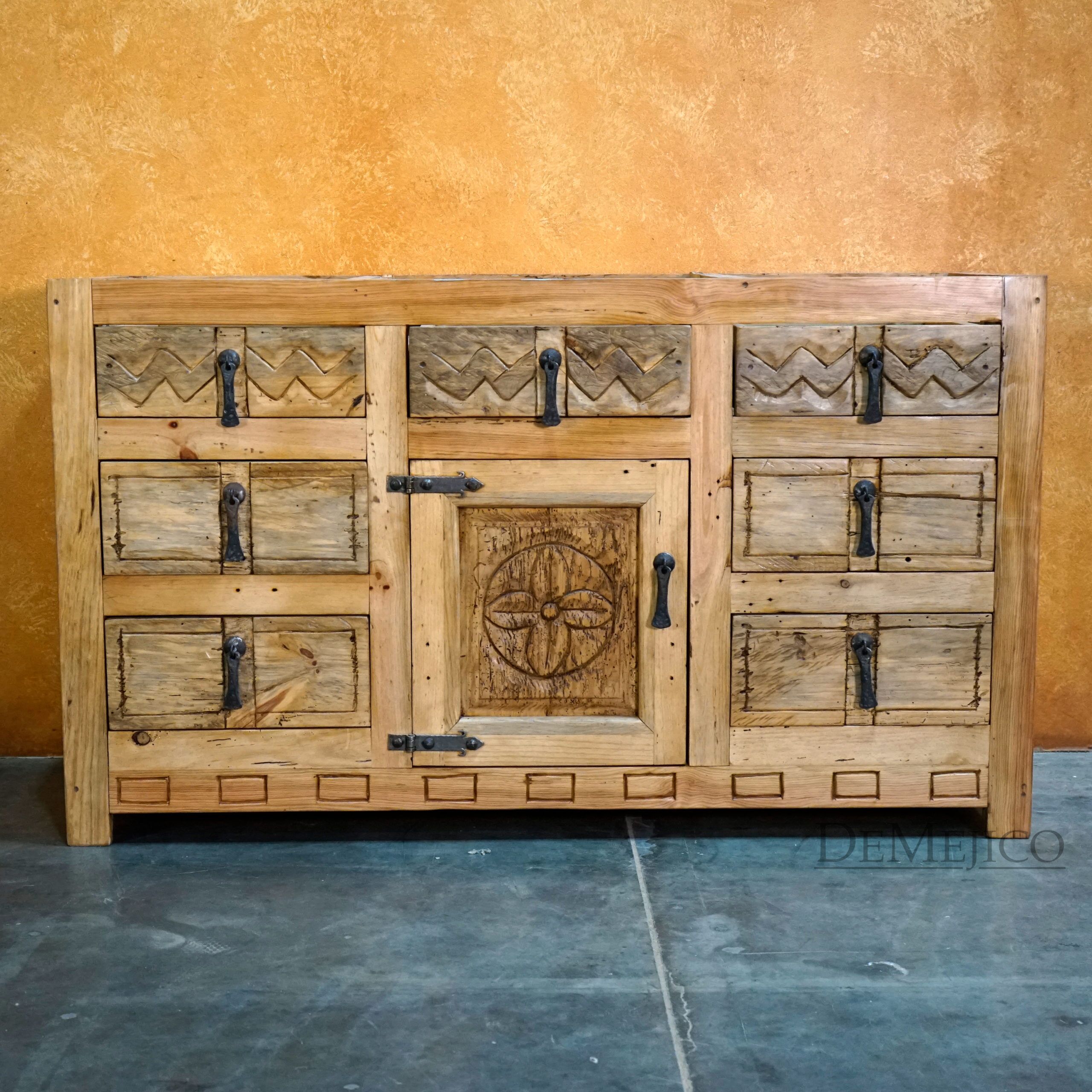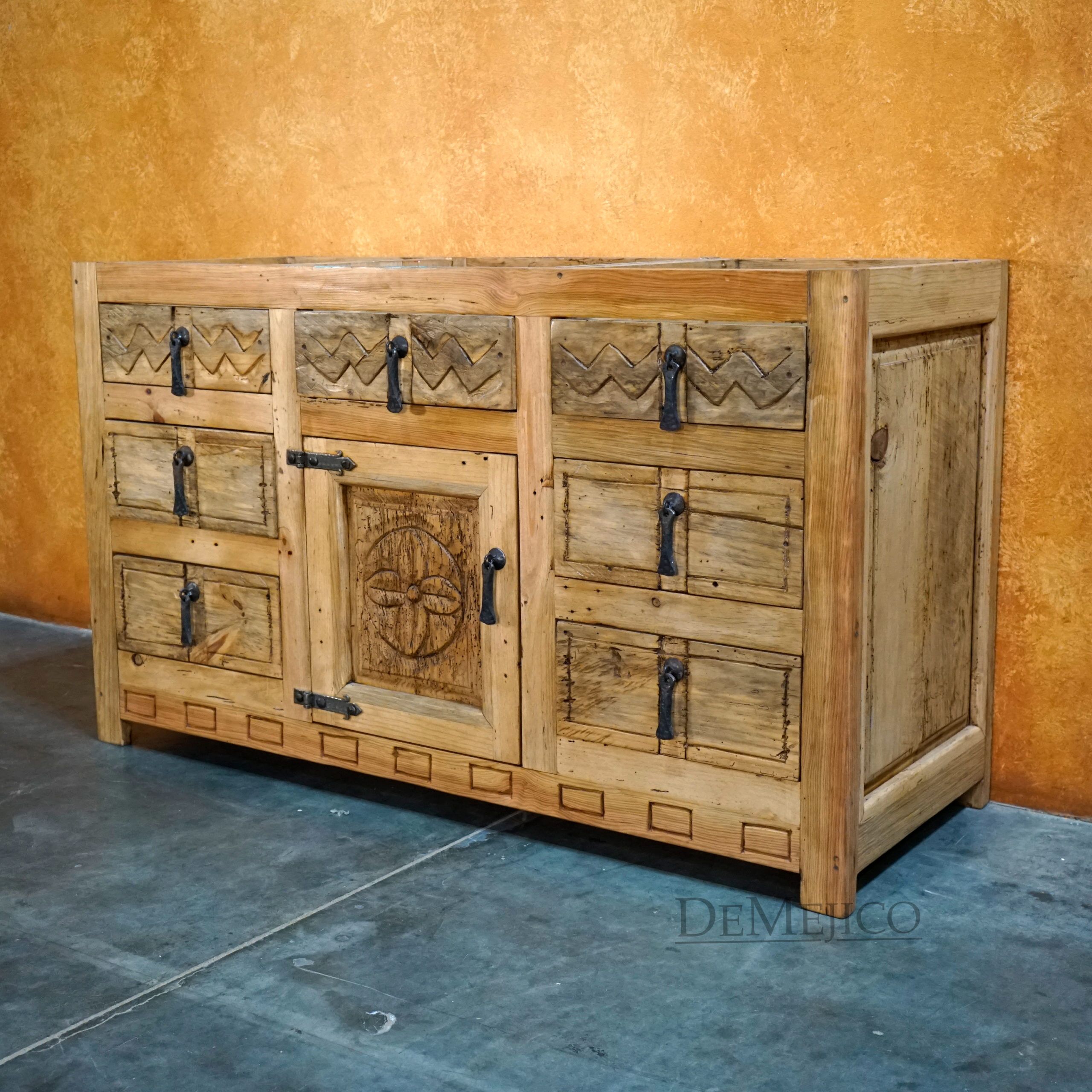 Newly designed, the Mirasol Vanity is a beautiful Spanish Colonial Vanity made from solid old wood. Grabbing your attention, the drawers and single cabinet feature hand carved Spanish Colonial designs, in our Mirasol style. Accenting these designs are raised panels and forged iron hardware, adding to that classic Spanish look. Finished with raised legs and a stain to enhance the wood and features, this piece is set to impress. Add the Mirasol Vanity to the already Spanish style of your home, or, just give your bathroom a touch of Spanish flair.