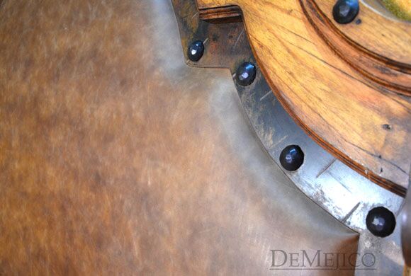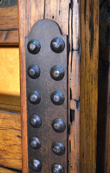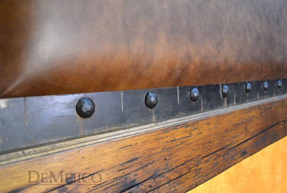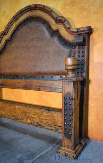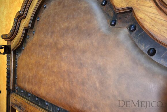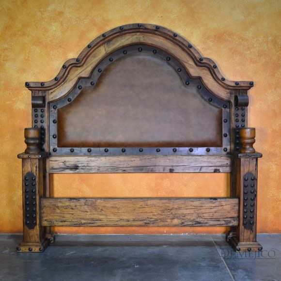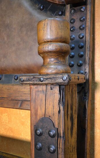 The Old Wood Alamo Bed takes design elements from classic, handcrafted Spanish origins. Being the main focal point of this Spanish leather bed, the arched headboard has been slightly narrowed, and is complete with a large hand-dyed leather piece that is smooth to the touch. Complimenting this, are hand pounded iron clavos placed around the leather and along the edges of the arched Alamo style, solid old wood frame. For an added touch, forged iron scrolls have been added on both sides, and are also accented with clavos. These materials and designs come together to create a breath-taking impression of old Spanish bedrooms.