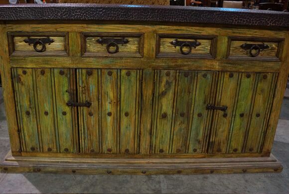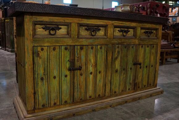 The Old Door Copper Top Buffet is made from solid old wood and original old doors. With four drawers and four cabinets, this copper top buffet has just the right amount of space for storage and display for any dining or entertainment space. Adding even more texture and giving this piece a unique touch, we have added a hand pounded copper piece to the top of this buffet. Finished off with a green Patina finish and our classic Spanish style rustic accents and hardware, this old wood buffet would fit any Southwestern or barn style home.