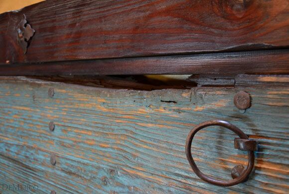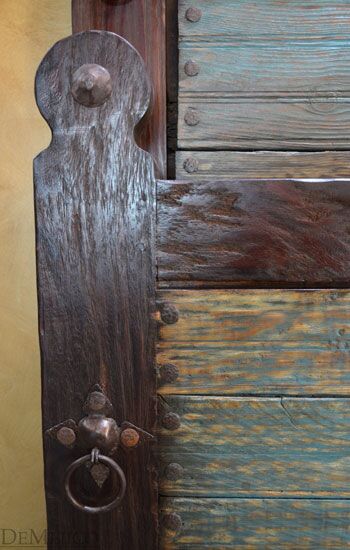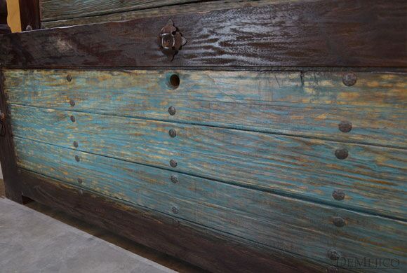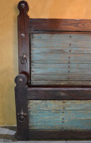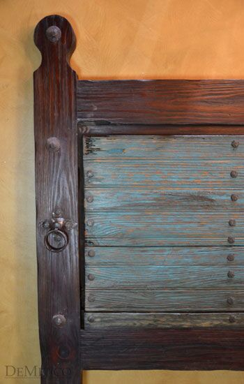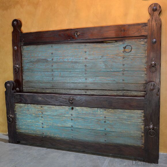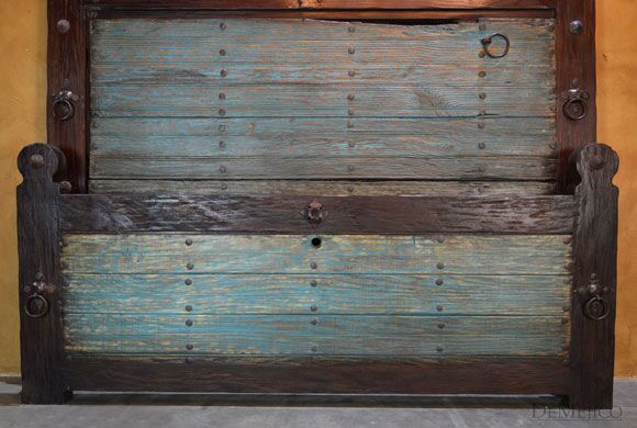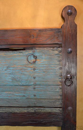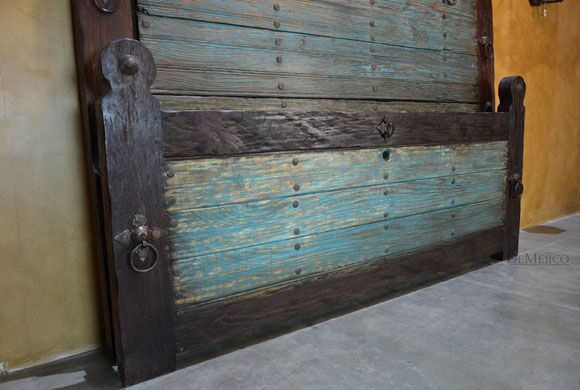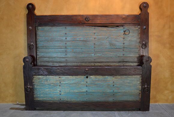 Made from genuine old doors for a rustic headboard, the Old Door Hacienda Bed with Patina is a beautiful bed featured in our Bedroom Catalog. The headboard and footboard of this bed are made up of original old doors, finished in an eye-catching blue Patina, and adorned with hand pounded iron clavos. Surrounding each of these doors is a simple frame, complete with a curved top and large iron clavos and hardware accents, for a rustic touch.