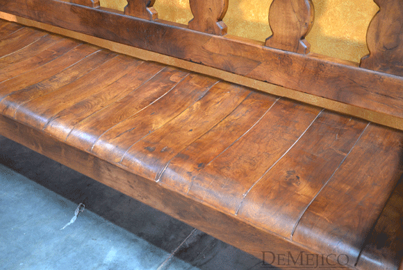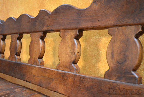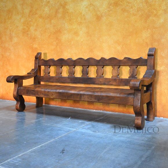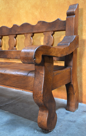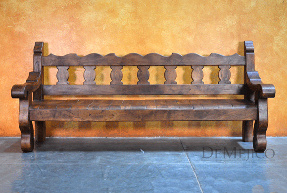 Featured in our Living Room Catalog, our Old Mexico Bench is a classically styled Spanish bench, with eye-catching elements. Completely hand crafted from solid mesquite wood, this bench features thick arms and legs, complimented by Spanish curves. Finished in an expressive stain, designed to bring out the natural grain patterns, the Old Mexico Bench can be indoors or even serve as an outdoor bench. With inspiration from Spanish Colonial Chairs, these benches are perfect for Spanish style spaces, whether they be your living room, outdoor patio, or even restaurant waiting area.