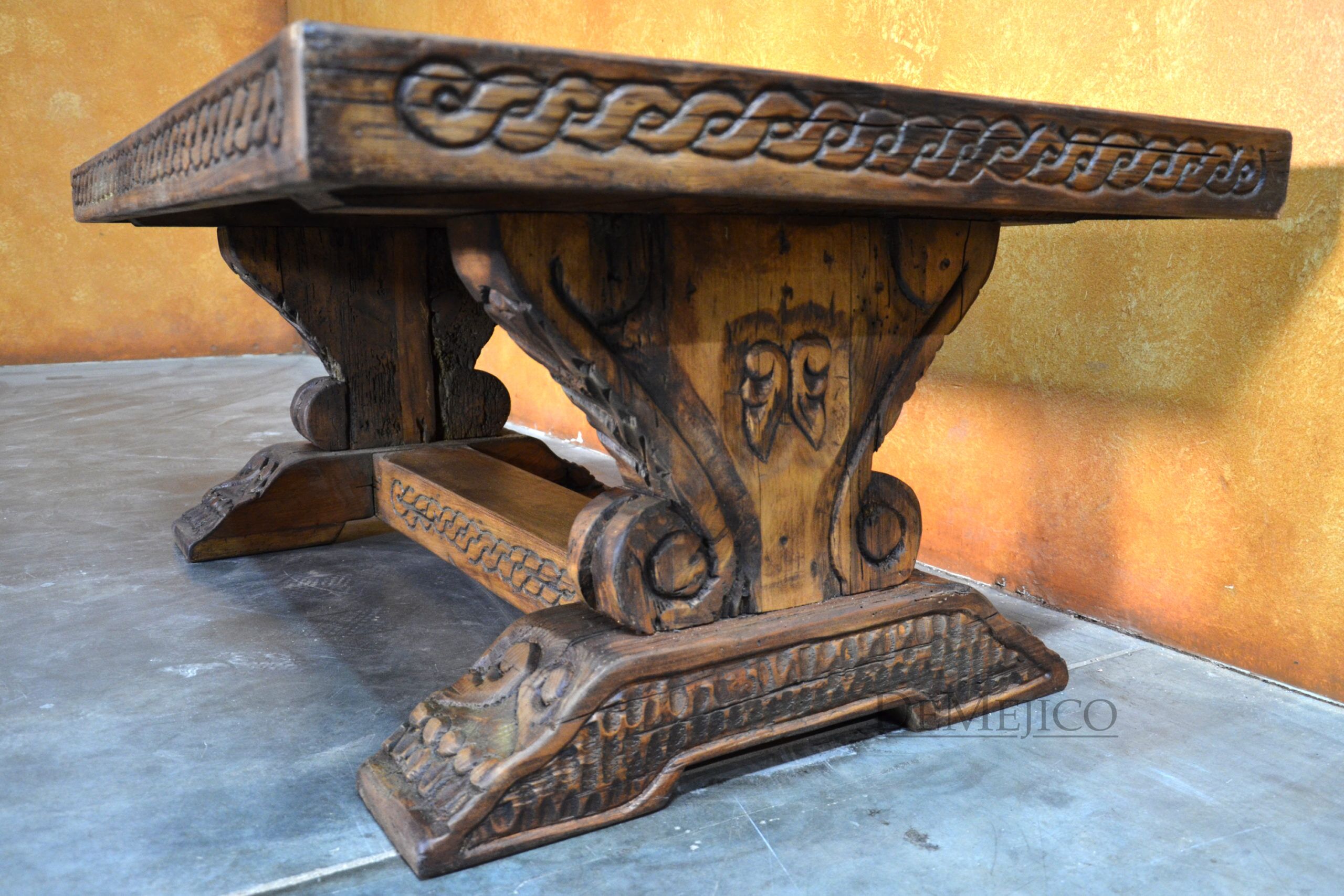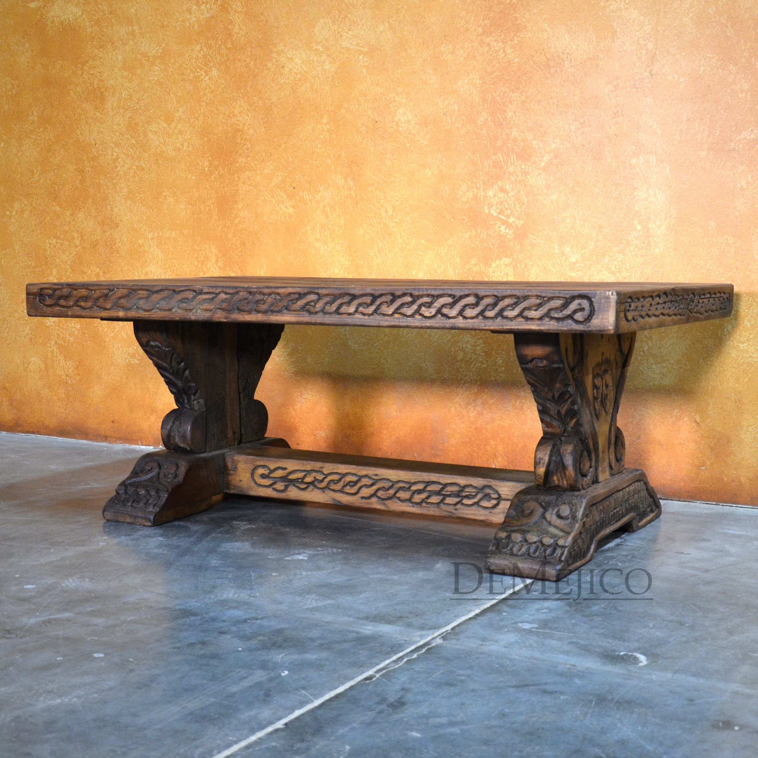 The Old Wood Armida Coffee Table is a stunning Spanish coffee table featured in our Living Room Catalog. Inspired by our Armida style dining tables, this coffee table is made from solid old wood, and features the same hand carved legs and trestle base, paired with a rope carved edge. With a smooth and thick top showing off hints of red, this carved coffee table showcases the natural knots, stretches and movements of the mesquite wood. The attention to detail featured on the Armida Coffee Table will bring an authentic Spanish touch to any living room or entertainment space.