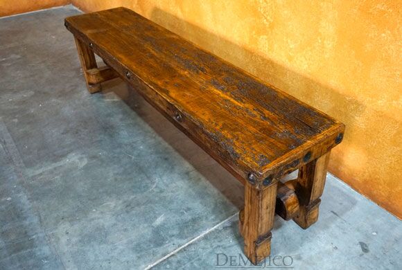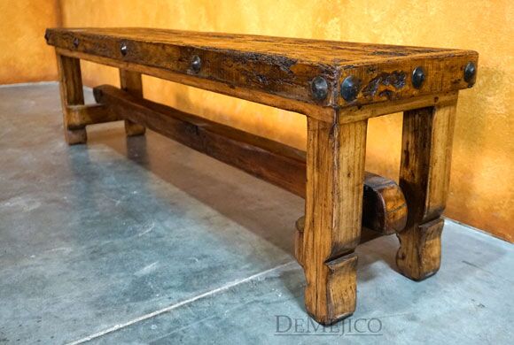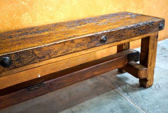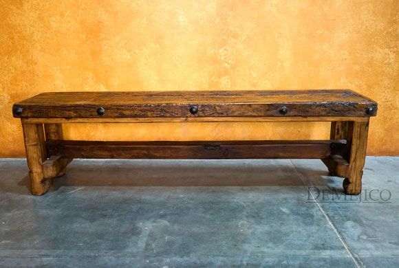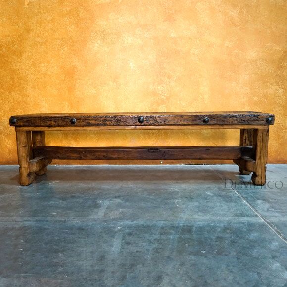 A mix of Old World and Colonial style design, the Old Wood Bench 6ft is a freshly designed piece, new to our Living Room Catalog. Made from solid old wood, this bench features a smooth seat that showcases the natural knots, stretches, and imperfections, giving it a classic, rustic look. Bringing out the Colonial style, the legs of this bench feature subtle hand carved curves, held together by a simple trestle base. For an added unique touch, this trestle was not only made from a once-functioning door, but also features the door’s actual hinges. Finally, giving the Old Wood Bench an authentic Old World feel, the seat’s edges are accented with hand pounded iron clavos.