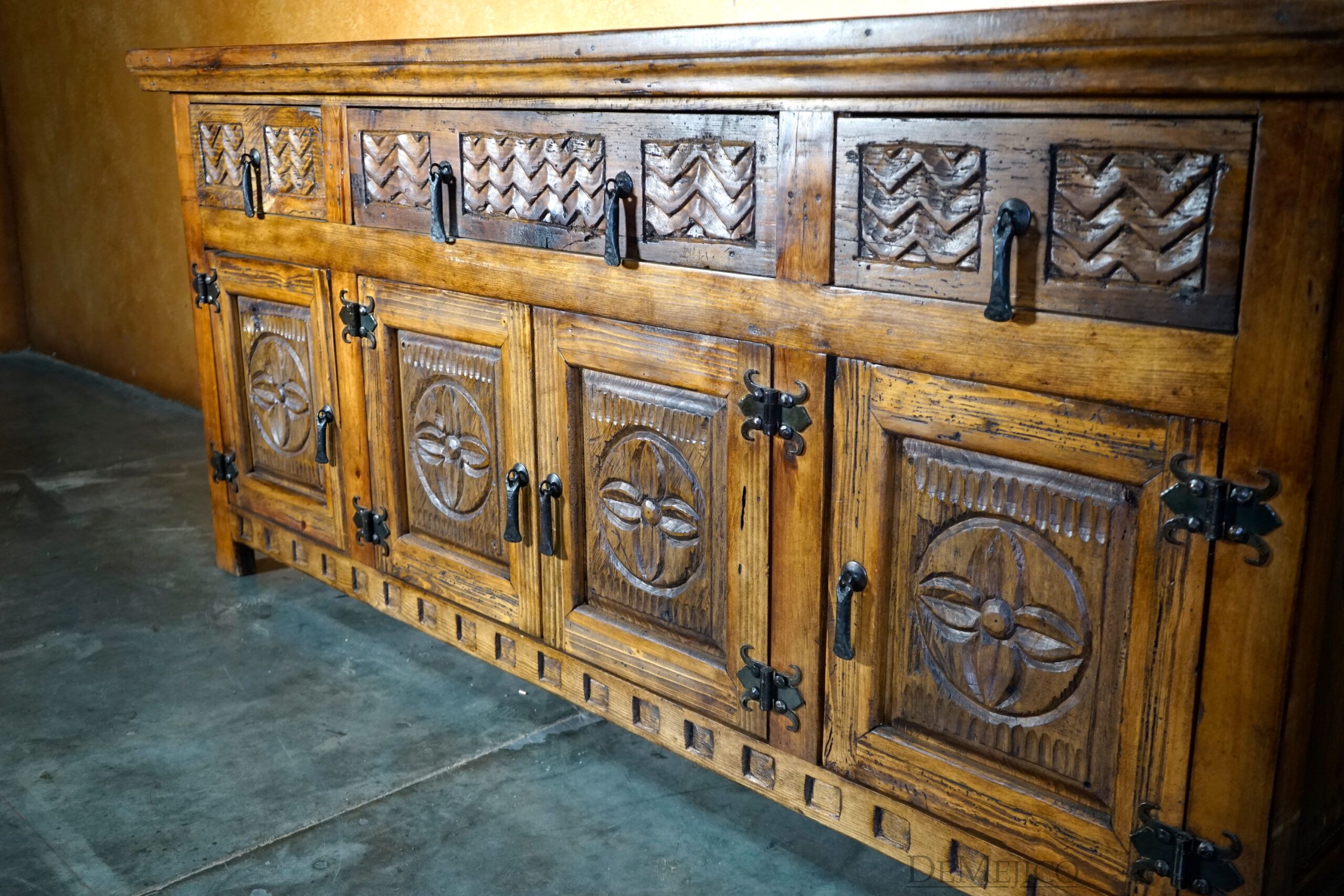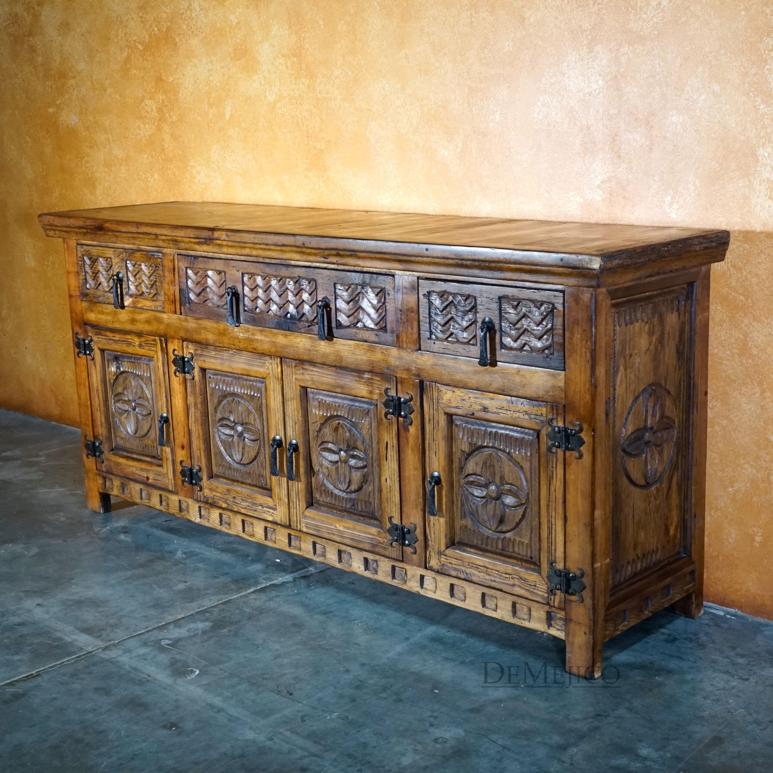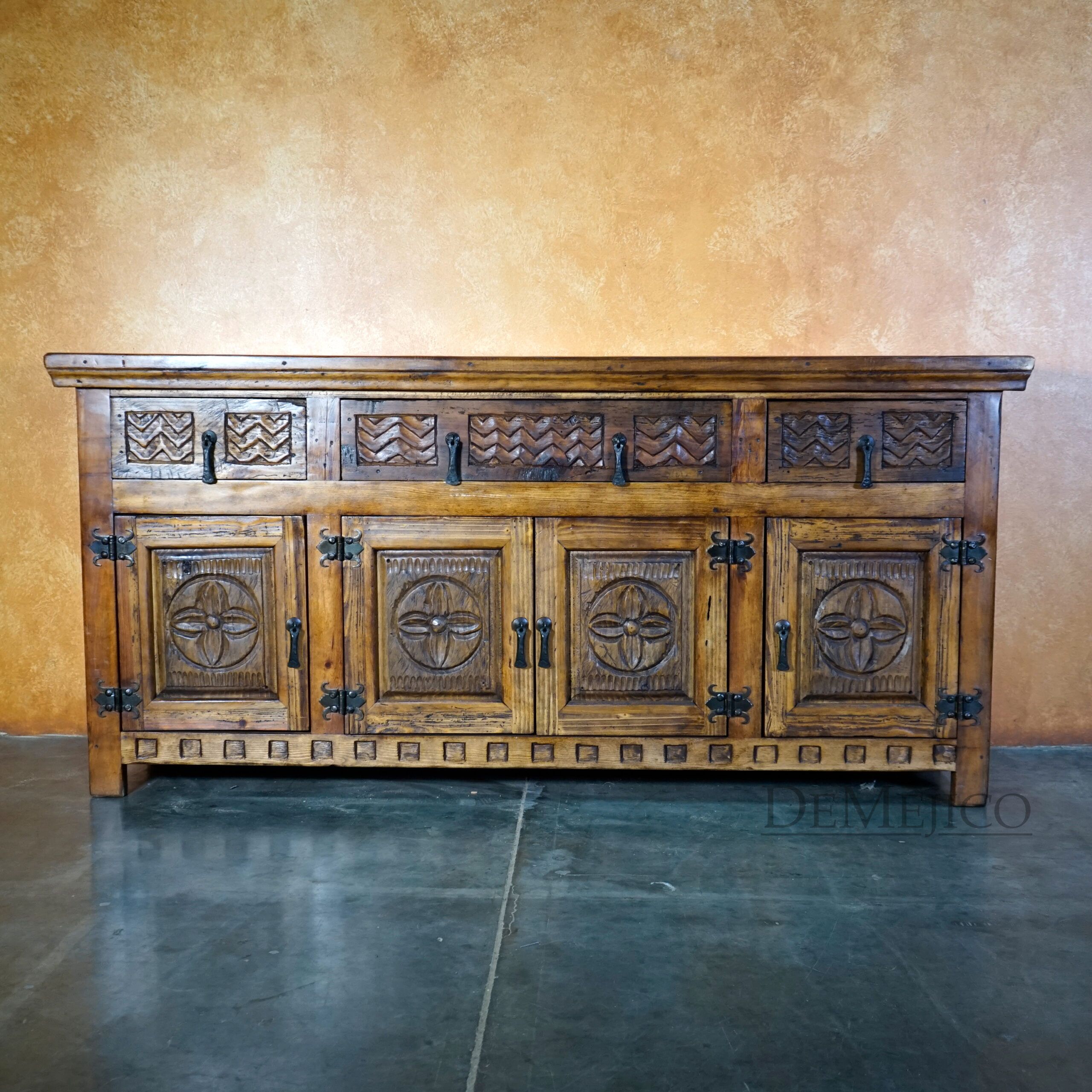 Newly designed, the Old Wood Buffet Mirasol is a beautiful Spanish Colonial Buffet made from solid old wood. Three drawers and four cabinets each featuring hand carved Spanish Colonial designs are the main focal points of this piece. Accenting these designs are raised panels and forged iron hardware, adding to that classic Spanish look. Finished with raised legs and a stain to enhance the wood and features, this piece is set to impress. Add the Old Wood Buffet Mirasol to the already Spanish style of your home, or, just give your dining or restaurant space a touch of Spanish flair.