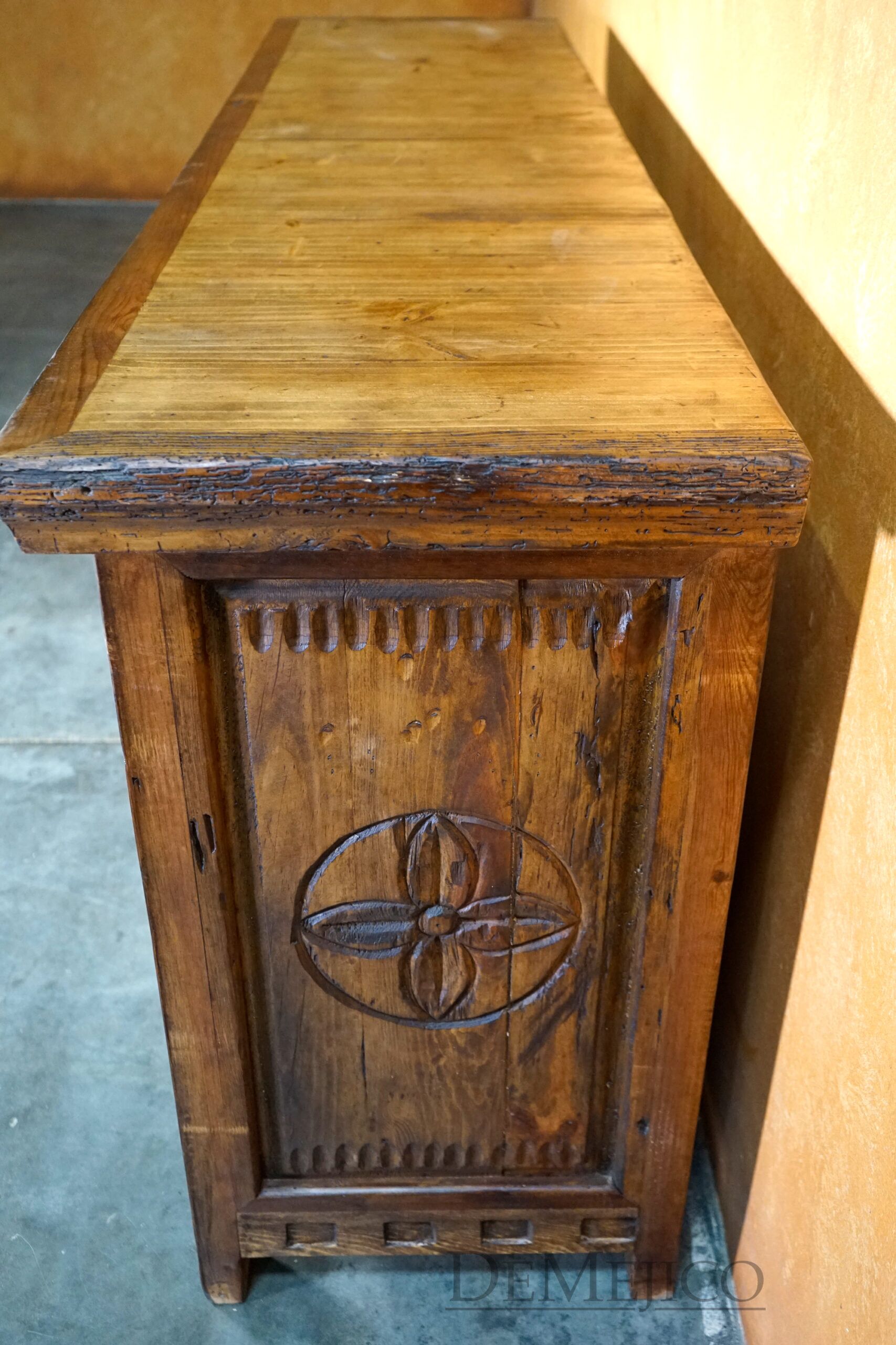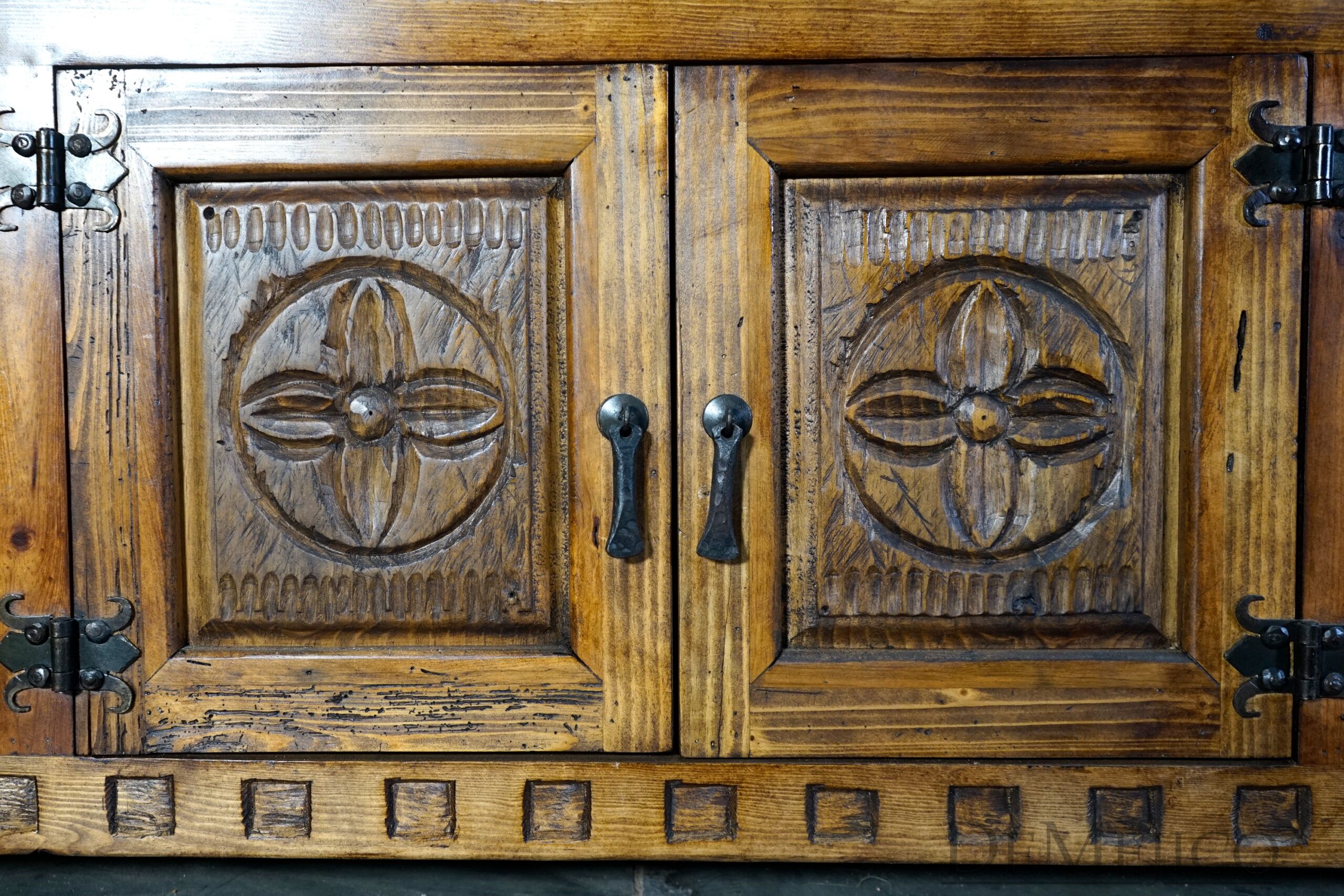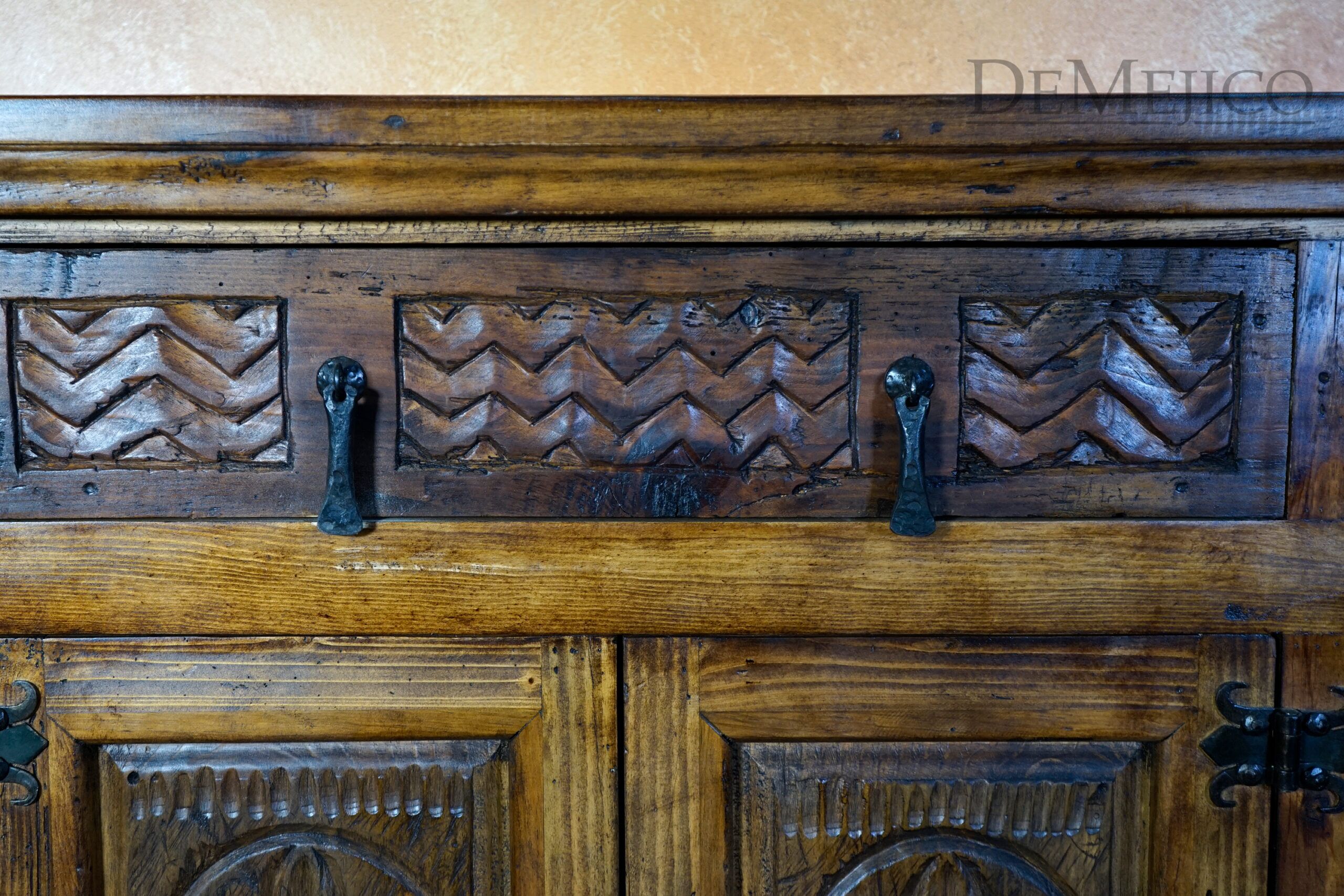 Newly designed, the Old Wood Buffet Mirasol is a beautiful Spanish Colonial Buffet made from solid old wood. Three drawers and four cabinets each featuring hand carved Spanish Colonial designs are the main focal points of this piece. Accenting these designs are raised panels and forged iron hardware, adding to that classic Spanish look. Finished with raised legs and a stain to enhance the wood and features, this piece is set to impress. Add the Old Wood Buffet Mirasol to the already Spanish style of your home, or, just give your dining or restaurant space a touch of Spanish flair.