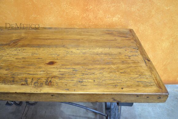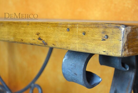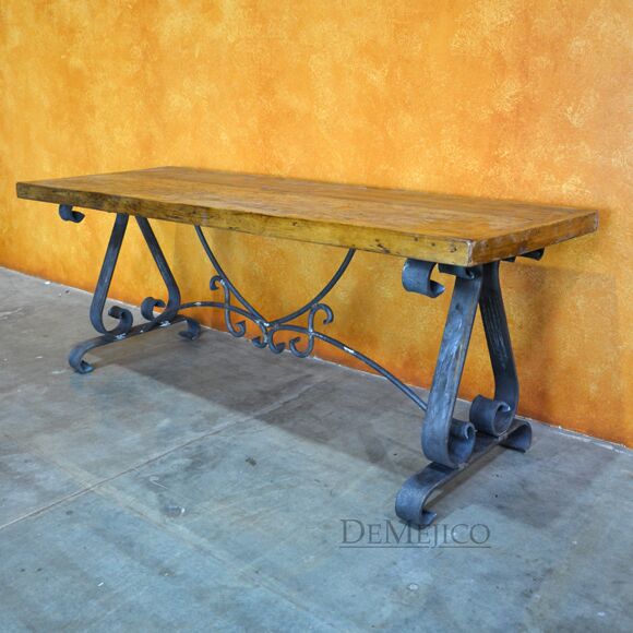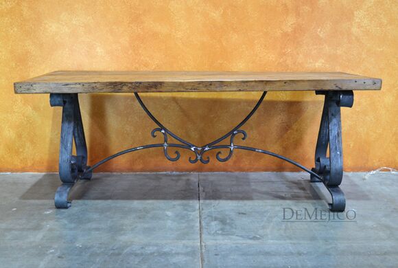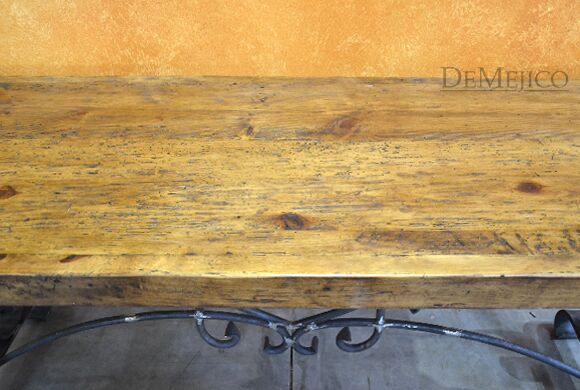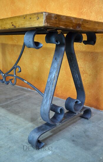 The Old Wood Espanola Table, featured in our Dining Room Catalog, is a version of our very popular Mesa Espanola table. This version of the table is made with the same solid wrought iron base, but features solid old wood as the tabletop rather than travertine stone. The solid wood tabletop has been laid in wide panels, showcasing and enhancing the natural stretches and imperfections of the wood. Finished off with a smooth sealer coat, this thick tabletop is ready for any dining space. Still true to the Mesa Espanola style design, the Old Wood Espanola Table has been classically paired with a scrolled, hand forged, wrought iron base, bringing out an elegant Spanish touch.