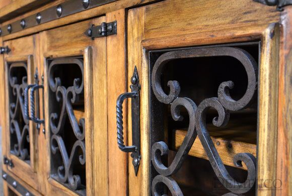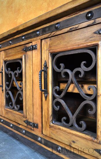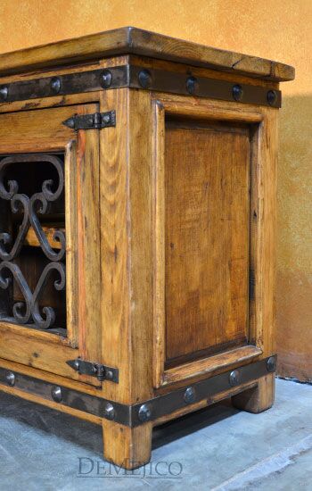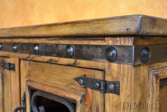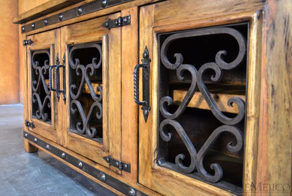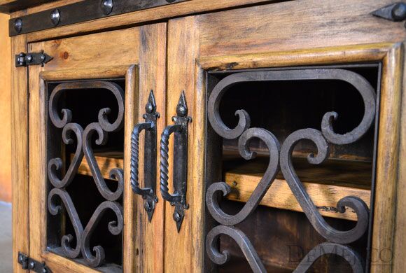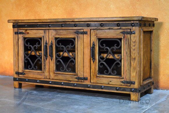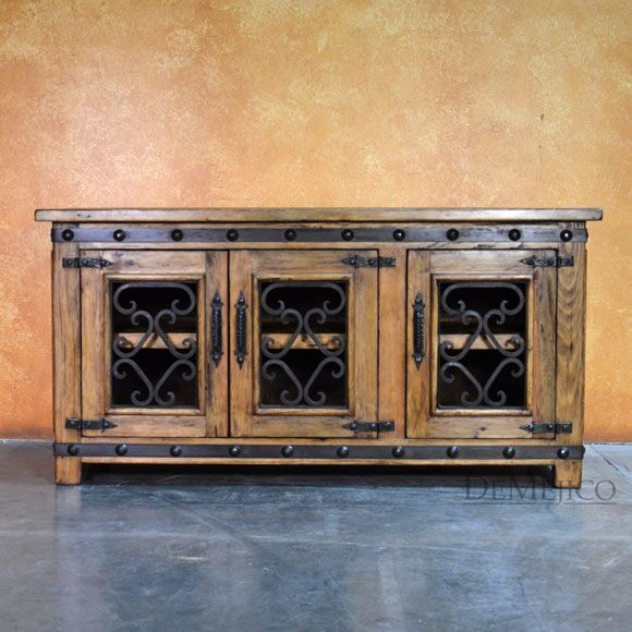 The Old Wood Espanola TV Stand is a beautiful addition to our Living Room Catalog, inspired by one of our most popular entertainment center designs. Carefully crafted from reclaimed wood, this Spanish entertainment center features a smooth surface that showcases its natural stretches and knots. Matching the raised paneling on the sides, three raised paneled cabinets on the front are complete with hand forged iron hardware panels. Opening up to a single shelf inside, this reclaimed wood tv stand has just enough storage space for all of your living room needs. Finished off with hand forged iron straps, clavos and pulls, the Espanola TV Stand is a perfect addition to any Spanish style entertainment space.