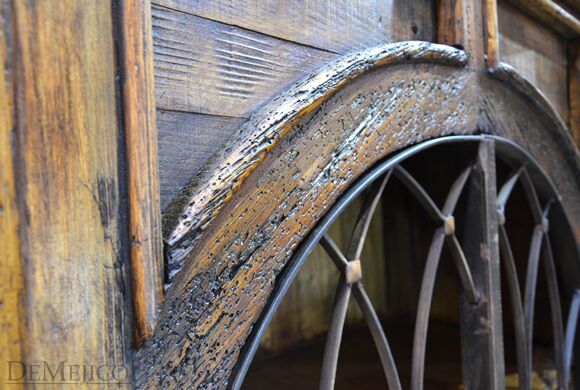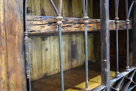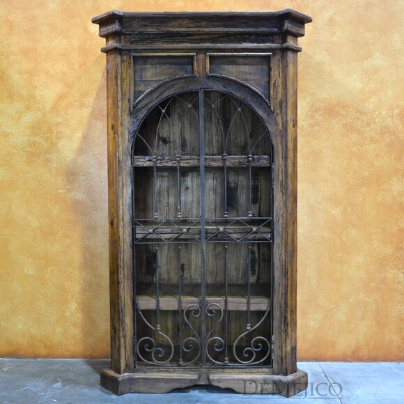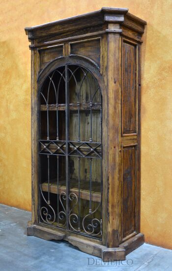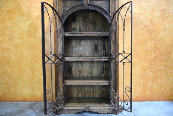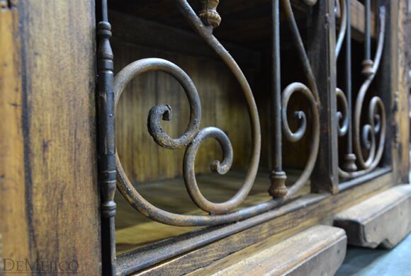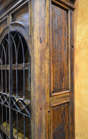 The Old World Armoire with Iron Doors is a newly designed piece, featured in our Living Room Catalog. Made from solid old wood, this rustic armoire beautifully showcases the wood’s natural stretches and knots, throughout the entire piece. Under its square top design, this tall iron door cabinet shows off arched top iron doors and raised paneling, enhancing the Old World Style. Beautifully hand forged, these iron doors are attention grabbing, as they feature both subtle and intricate detailing. With four shelves on the inside, this large Spanish armoire has an ideal amount of storage for any medium to large sized space. Use the Old World Armoire with Iron Doors as a display hutch or wine cabinet in your kitchen or entertainment space.