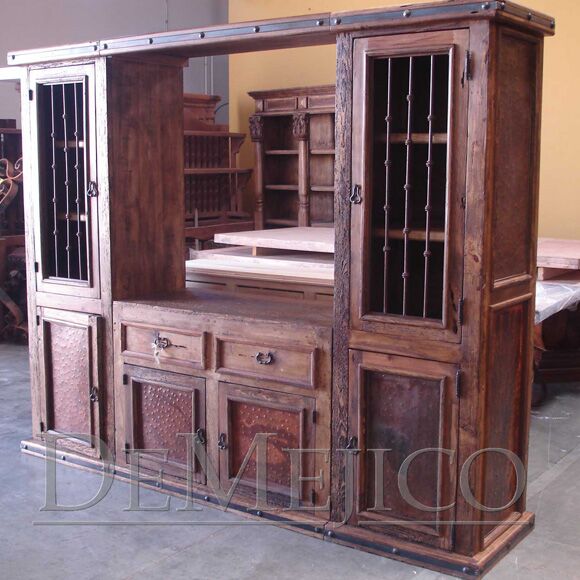 The Old Wood Copper Entertainment Center is a beautiful and large Rustic Spanish piece featured in our Living Room Catalog. Featuring iron straps with hand pounded iron clavos, iron grills, and hand pounded metal paneling, this entertainment center showcases classic elements of rustic Spanish design. With a large space for your television, along with shelving, drawers, and cabinets, the Old World Entertainment Center provides a great deal of storage space.