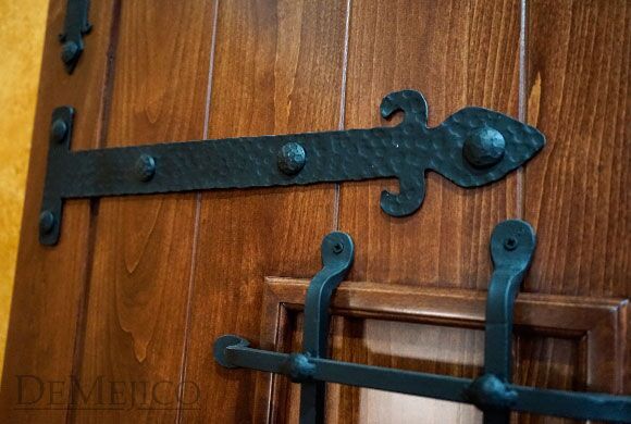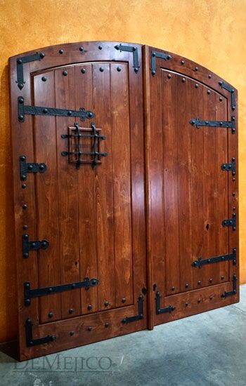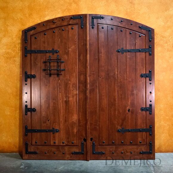 The Old World Door is a pair of Spanish entry doors that perfectly represent Old World style. Made from solid Knotty Alder wood, these double doors feature a subtle free flowing arch, surrounded by a transom on top, and sidelights on each side. Laid in thick vertical planks, these entry doors beautifully showcase the natural movements of the wood, giving off that perfect, rustic look. Enhancing the Old World style of these Spanish entry doors, the left door is complete with a large hand forged iron grill and the right door is complete with a rounded door knocker, while both doors feature both large and small iron straps. Completing the Old World Door, hand pounded iron clavos run along the perimeter, as well as on the tops and bottoms of the vertical planks.