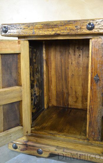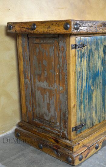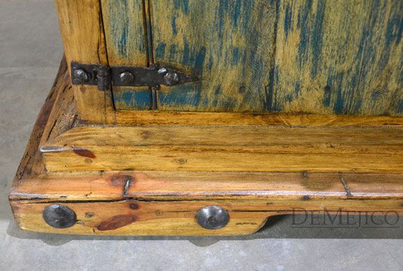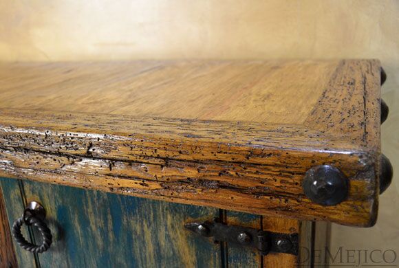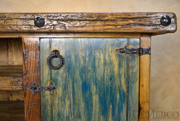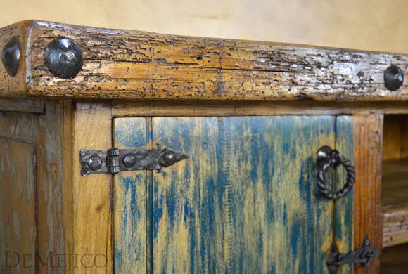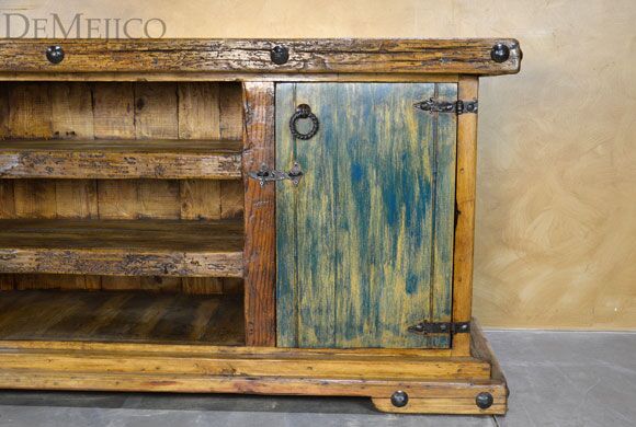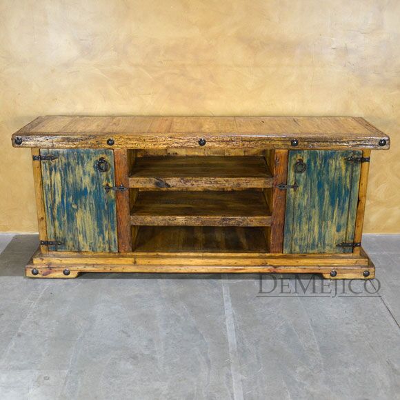 A new addition to our Living Room Catalog, the Old World Patina TV Stand is a classically styled rustic entertainment center with Old World influences. Made from solid old wood, this entertainment center features a smooth top laid in short planks, along with a beveled edge bottom. For storage and display, this entertainment center features two shelves, with two cabinets, one on each side. A green Patina finish, as well as classic Old World style hardware completes these two cabinets, and gives off an authentic rustic feel. Continuing with the Old World style, this piece is finished off with large, hand pounded iron clavos along the top edge and raised bottom legs.