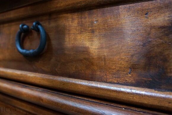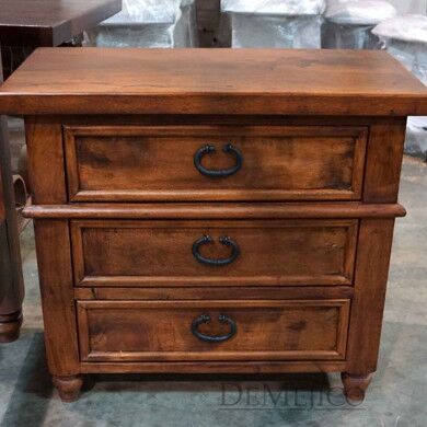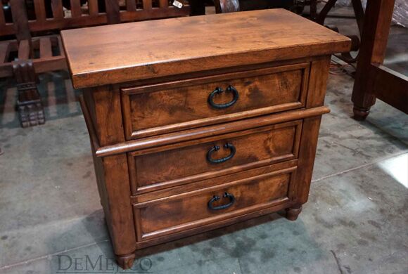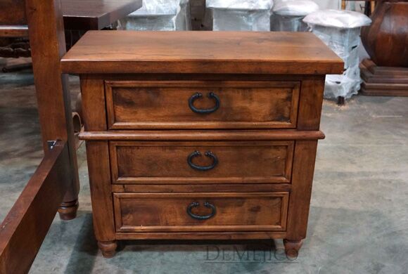 This Paradiso Mesquite Nightstand is a simple nightstand featured in our Bedroom Catalog. Carefully crafted from solid mesquite wood, this piece features three drawers for a great deal of bedside storage space. Subtle raised paneling and hand forged iron hardware finish off the Paradiso Nightstand, allowing it to fit into any bedroom style. Complete your bedroom set by pairing this nightstand with the Paradiso bed.