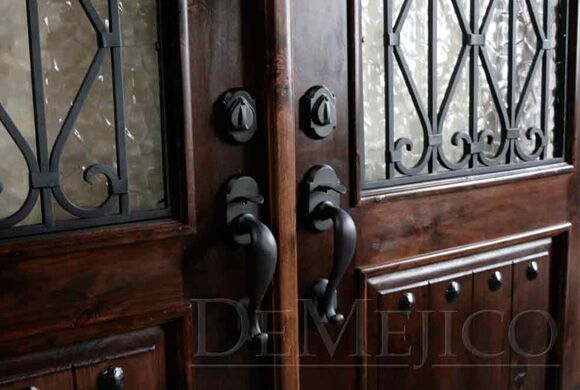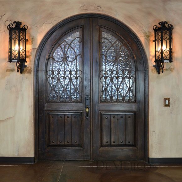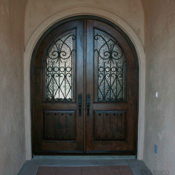The Puerta Constellation are a set of beautiful, Spanish glass exterior doors featured in our Door Catalog. These double doors feature a full Spanish arched with a raised panel accented with hand pounded iron clavos. At the focal point, The Puerta Constellation carries a stunning presence with traditional hand forged wrought iron grilles.