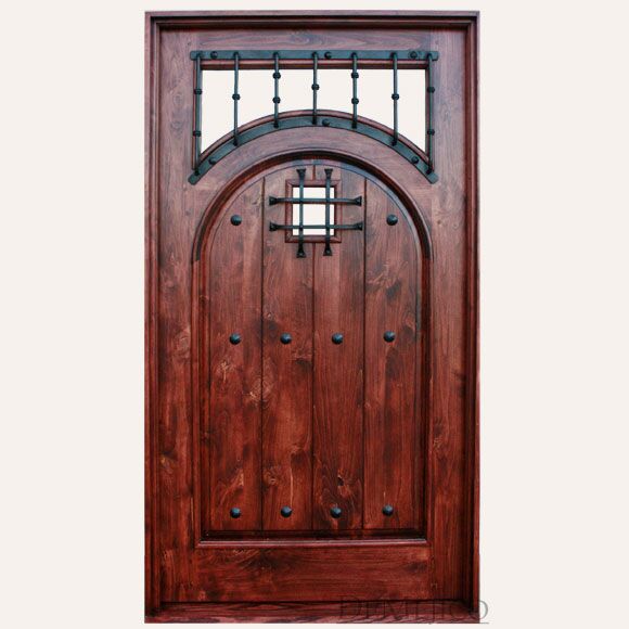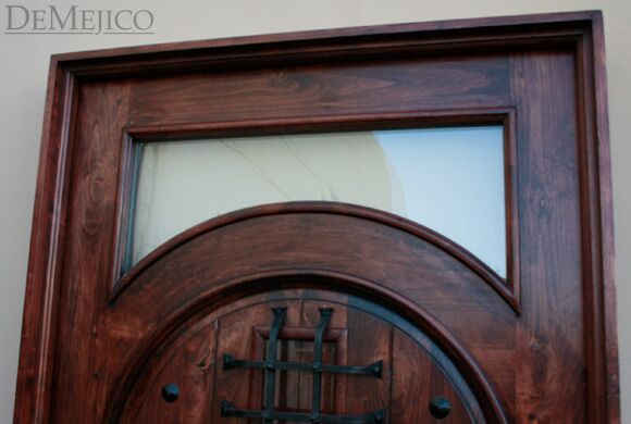 As front doors, the Puerta Espanola is a unique and custom door in our Door Catalog. With a square top frame, this door features a full arch panel design that beautifully showcases all of the natural movements and imperfections of the wood. A glass opening at the top provides both lighting and privacy, and is layered under hand forged wrought iron bars. Further enhancing the Old World feel, hand pounded iron clavos have been added to the arched panel, and a small iron grill has been placed over an added small glass speakeasy.
