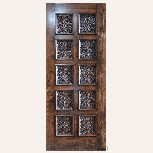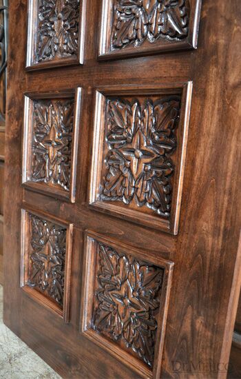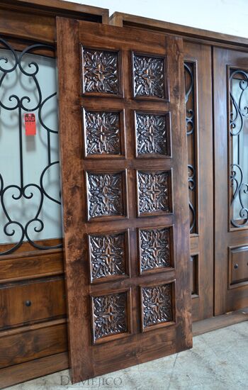 As carved entry doors, the Puerta Hoja Square Top is a version of our arched top, Puerta Hoja. This beautiful, hand carved door is made from solid knotty alder wood and features intricately hand carved paneled designs. Ask us how we can customize this door for your space.