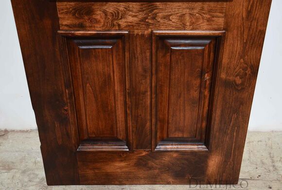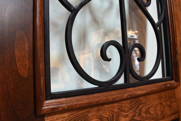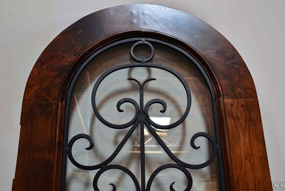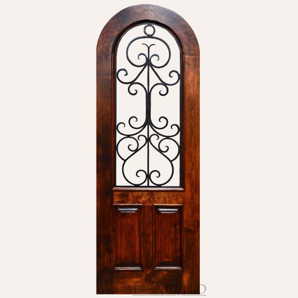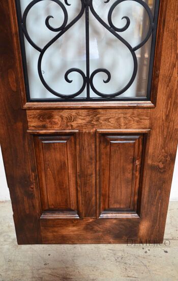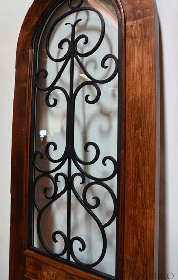 Glass interior doors, the Puerta Lucia is another one of our arched doors featured in our Door Catalog. Made from solid Knotty Alder wood, and finished in a dark stain, the beautiful stretches and knots of the wood are subtly showcased. Grabbing your attention, a wrought iron piece has been carefully hand forged into the top panel of this door, and serves as the main focal point. Lastly, a smooth, raised double panel finishes off the bottom of this piece.