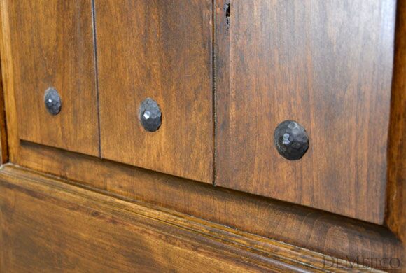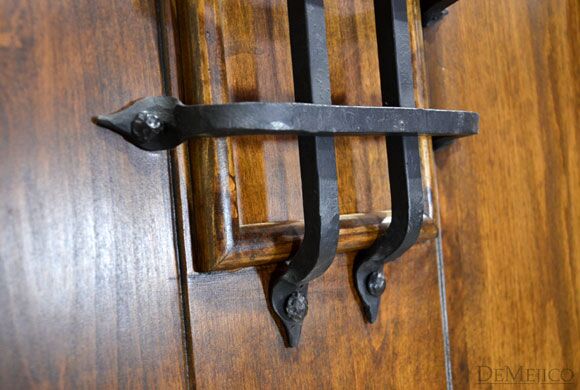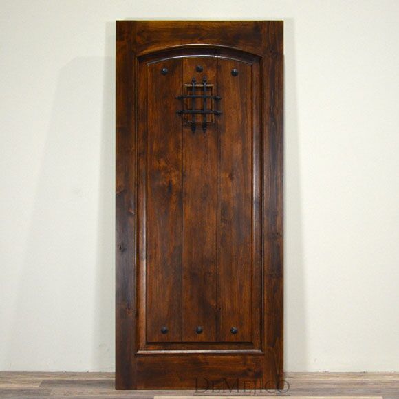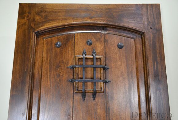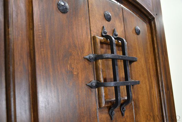 From knotty alder wood, the Puerta Palomar is a traditional Spanish door made with the style of craftsman entry doors. Featuring a single, raised moulding, panel design with a soft, Spanish arch, the knotty alder wood is beautifully showcased as it is laid in three vertical planks. Accented by hand pounded iron clavos and an iron grill over small speakeasy, the Puerta Palomar is given a simple Spanish touch with a rustic feel. Ask us how we can custom make this Spanish door to your specifications.