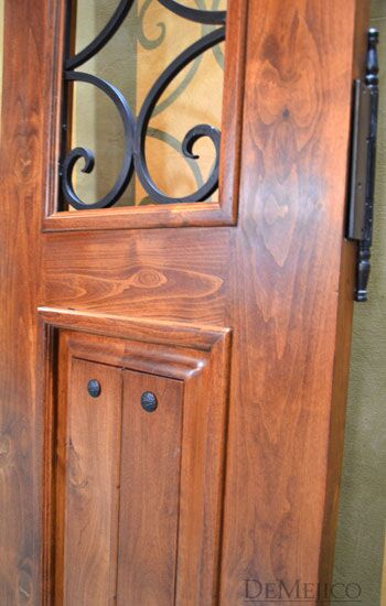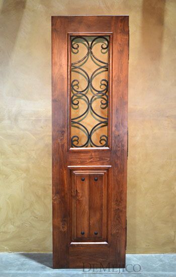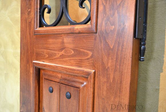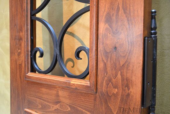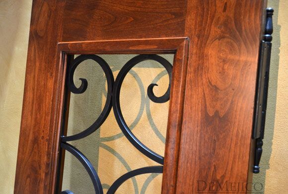The Puerta Santa Clara Pantry stands out as a beautiful Spanish pantry door. This beauty features curled hand-forged iron as the top panel and main focal point. Below, a simple raised panel design shows off natural knots and stretches of the wood. Accented with hand pounded iron clavos, the Puerta Santa Clara Pantry is an eye-catching addition to any kitchen space.