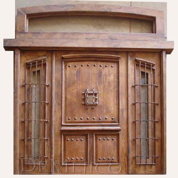 As rustic doors, the Puerta Tradicional is a beautiful Spanish transom door featured in our Door Catalog. Made from solid Knotty Alder, this door features raised paneling with vertical planks of wood that beautifully showcase the natural stretches and movements of the wood. With two large sidelights on each side and a transom on top, the Puerta Tradicional will allow ample amounts of natural light to flow into your home. Completing the Spanish style, this door is accented with hand pounded iron clavos, a small iron grill over a speakeasy, and two large iron grills over each sidelight. Ask us how we can customize this classic beauty to fit your home.