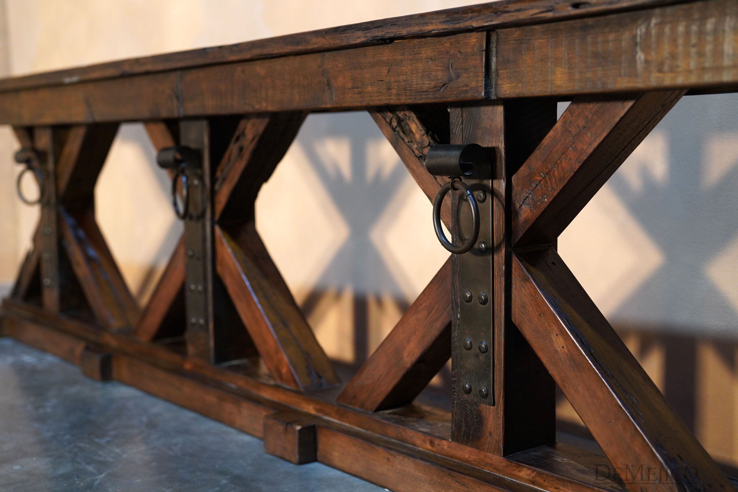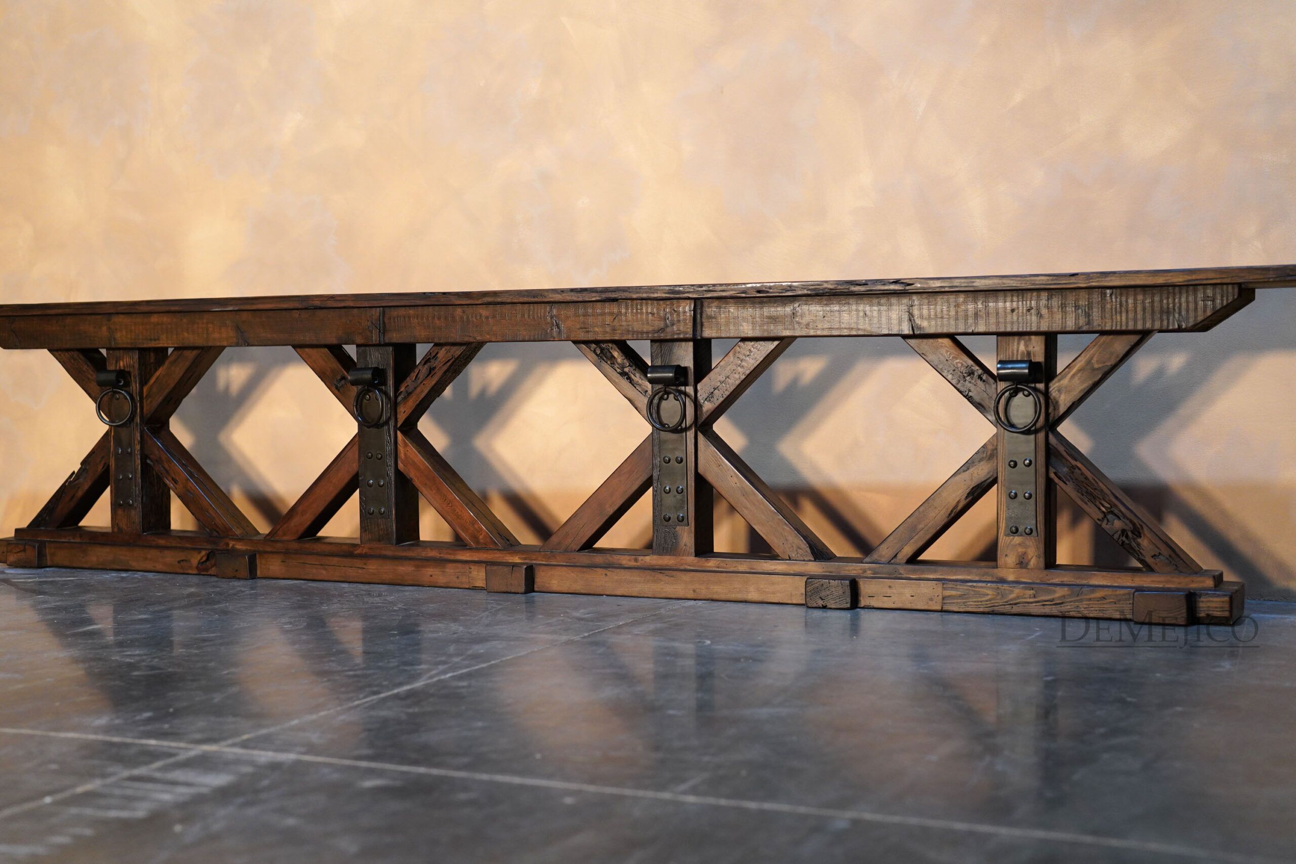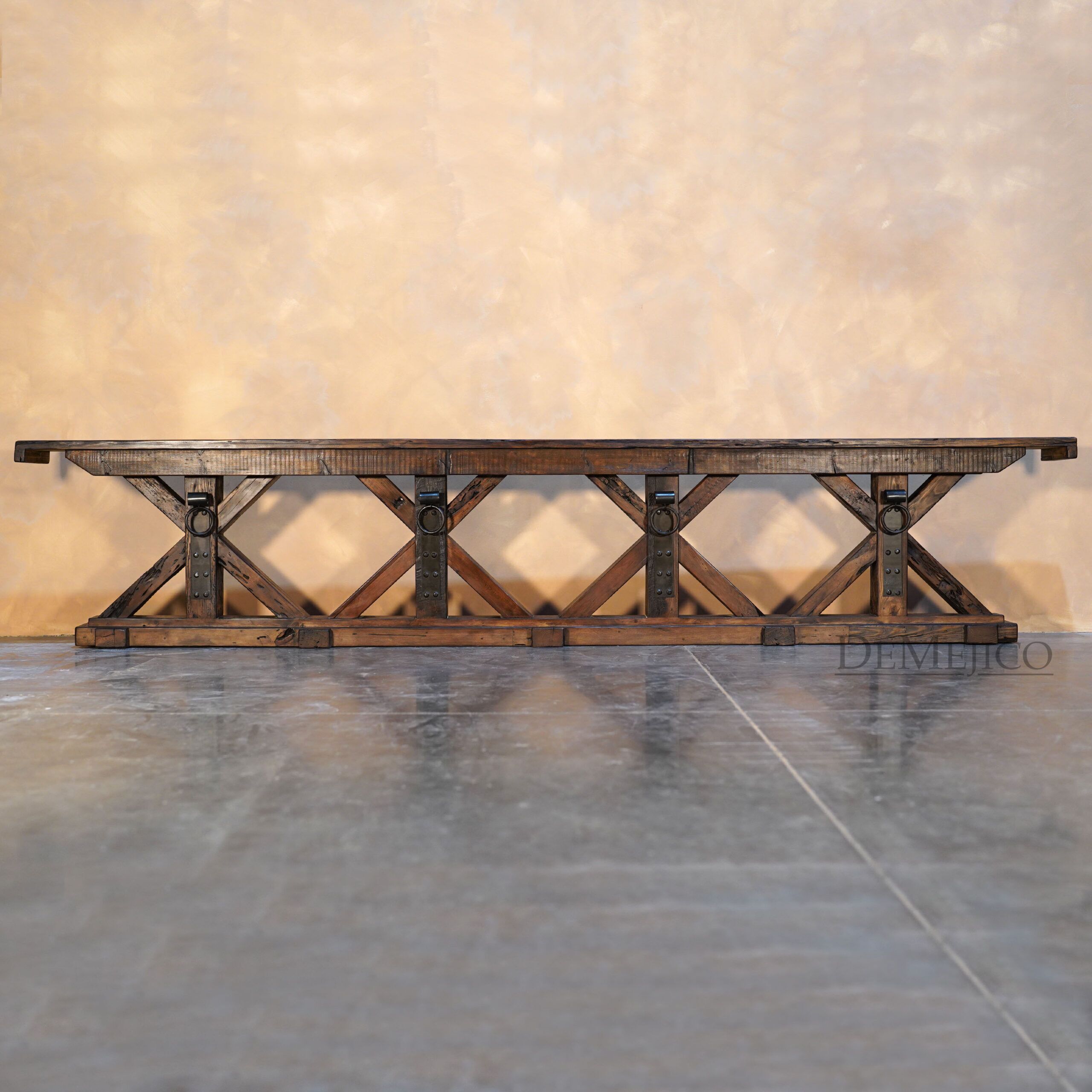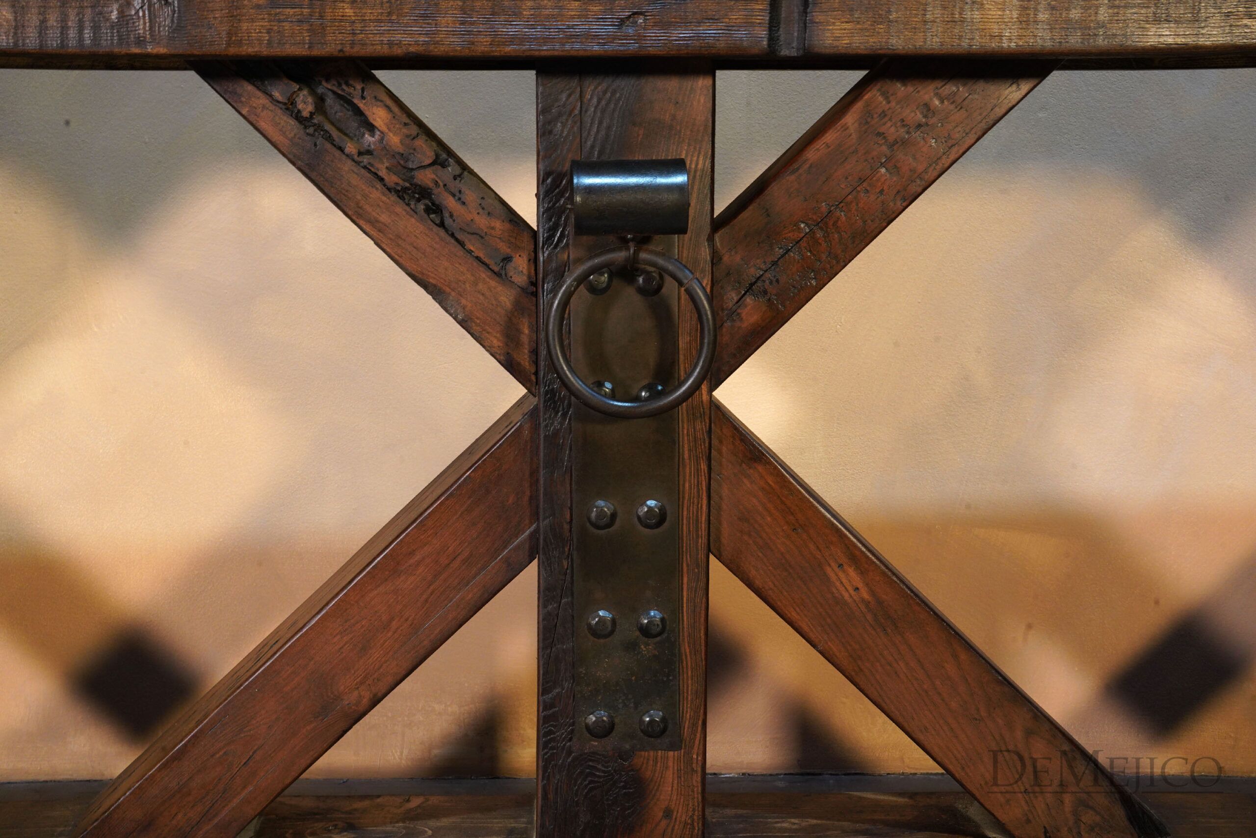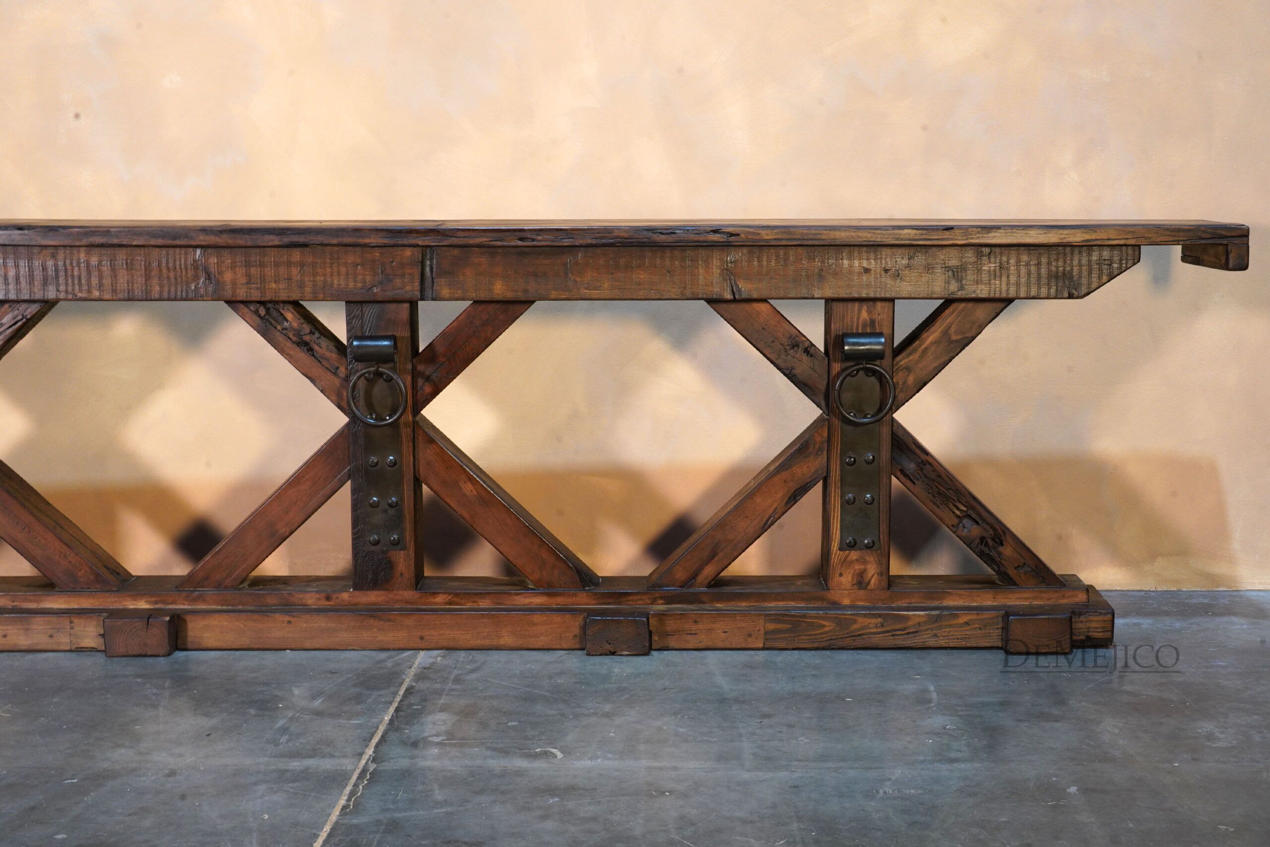 The Reclaimed Rustic Barn Console Gigante is made from reclaimed wood and solid lumber beams, with a touch of Farmhouse Style. Showcasing all of the natural knots, stretches, and imperfections of the wood, the top of this rustic console table is an original lumber piece, with inset grooves and beautiful color variations. Under this thick top, the wood legs have been placed in X-shape bases, really enhancing the mix of styles for this Spanish Farmhouse Console Table. Finishing off this Farmhouse Console Table, a single hand forged iron plate and accent ring have been added in each of the centers of the bases. Guaranteed to grab the attention of your guests, this rustic wood console table will fit into any Old World Spanish, rustic or farmhouse styled home.