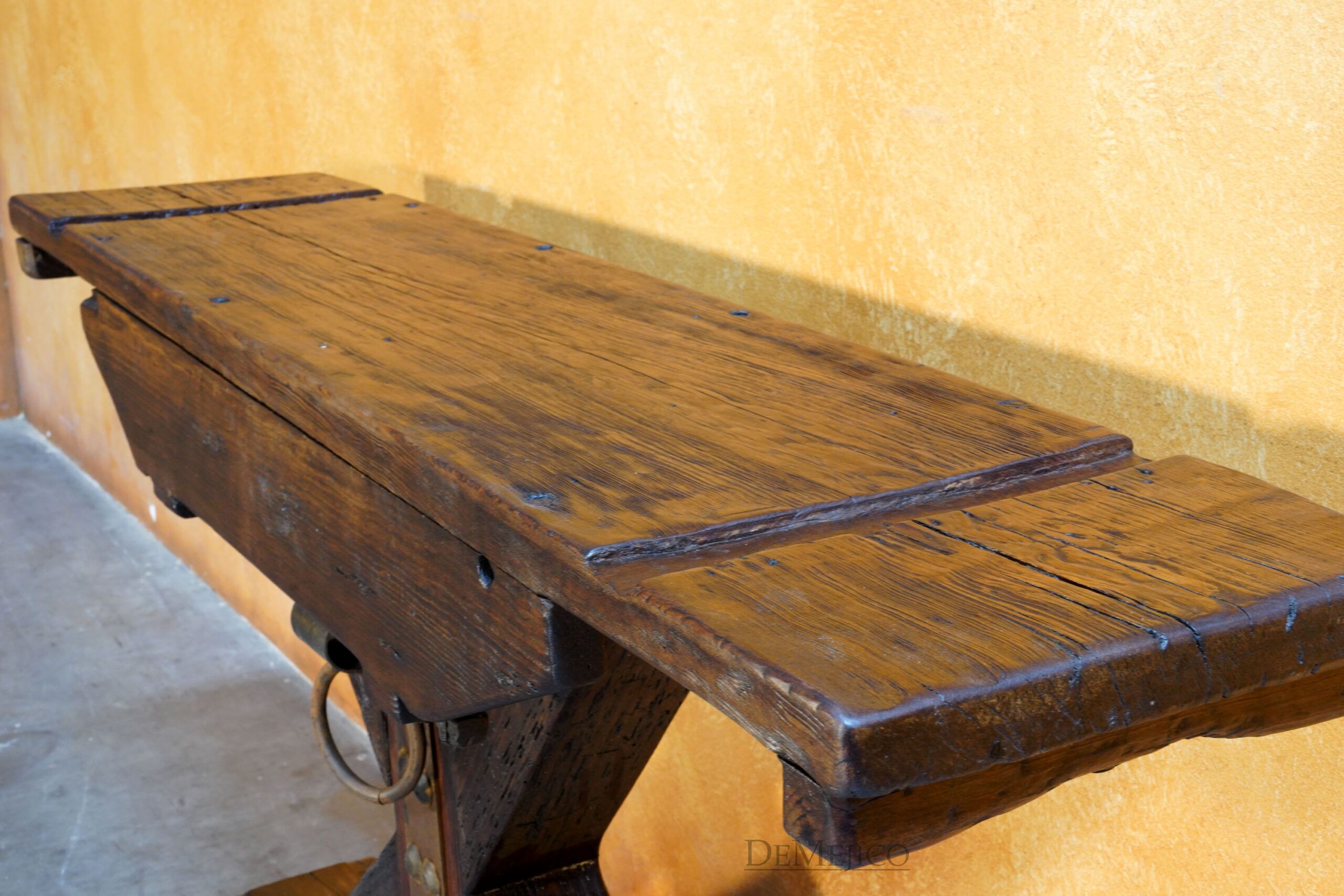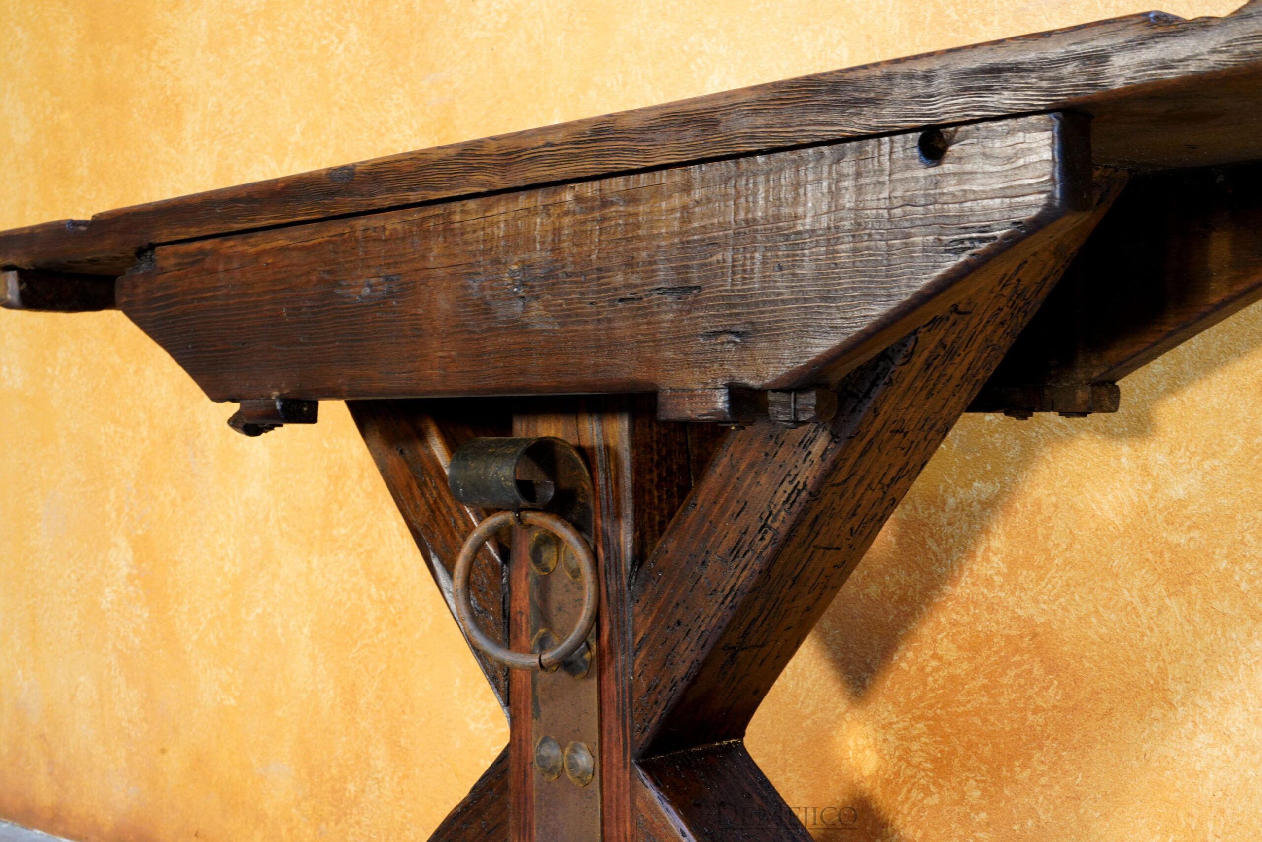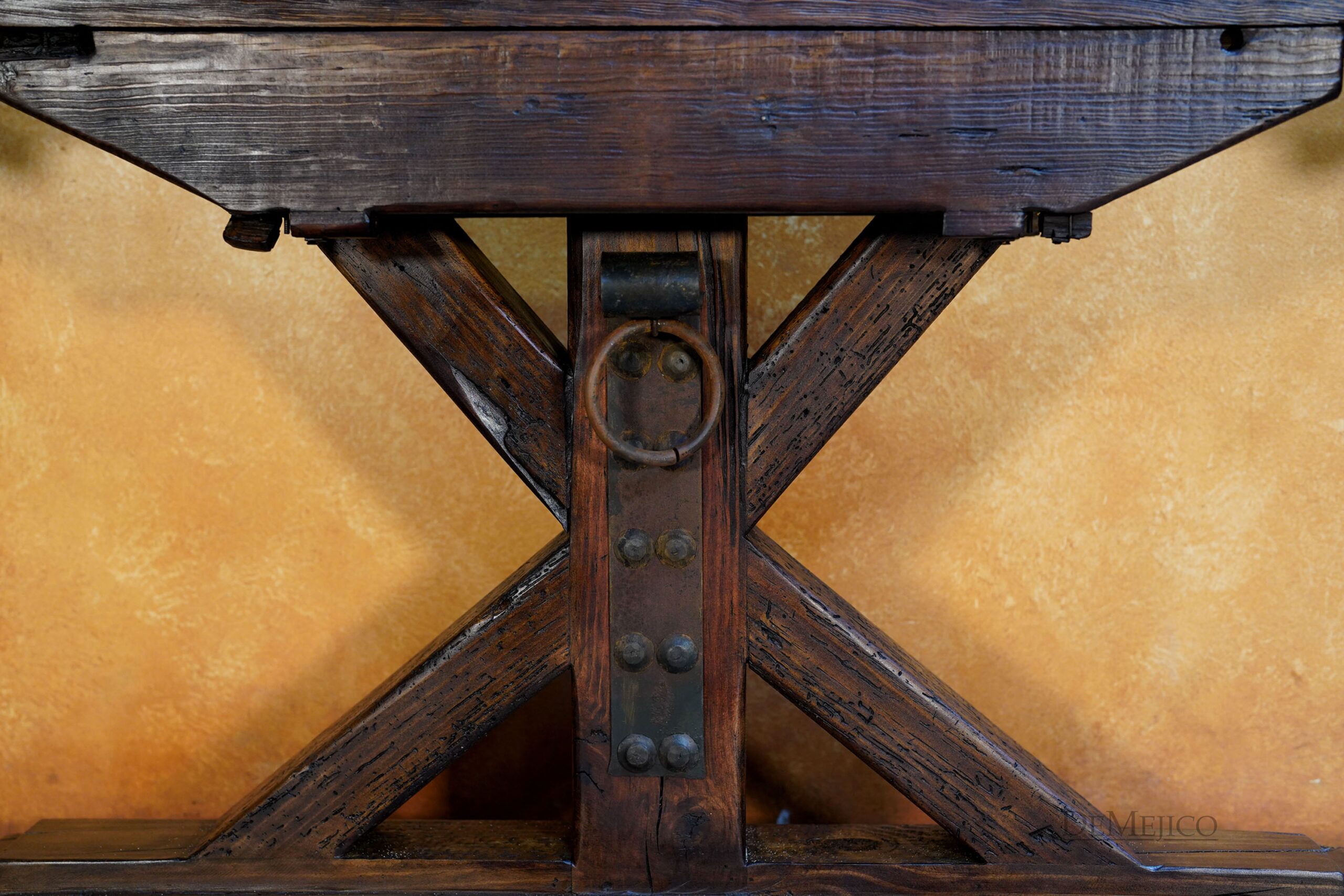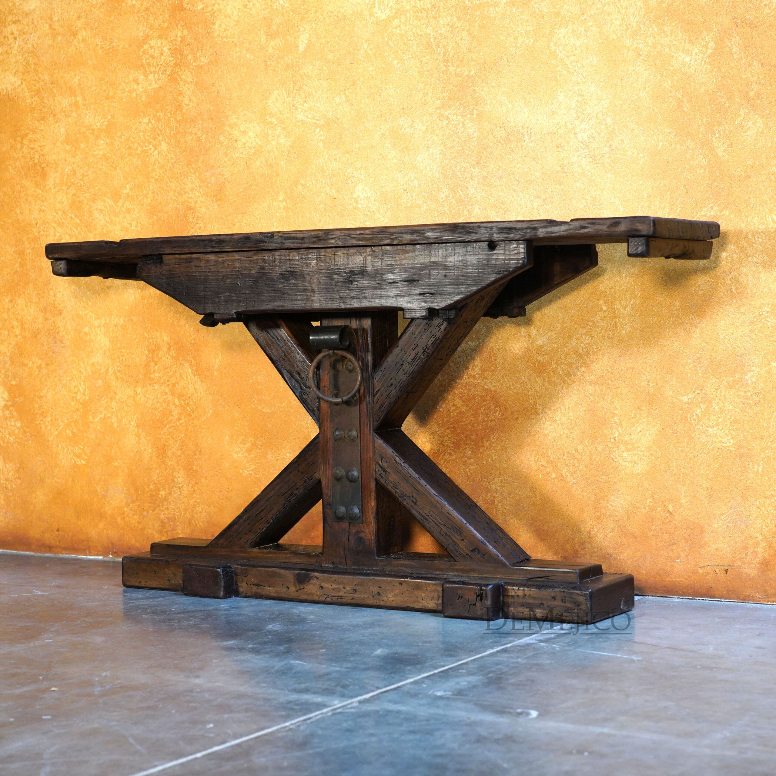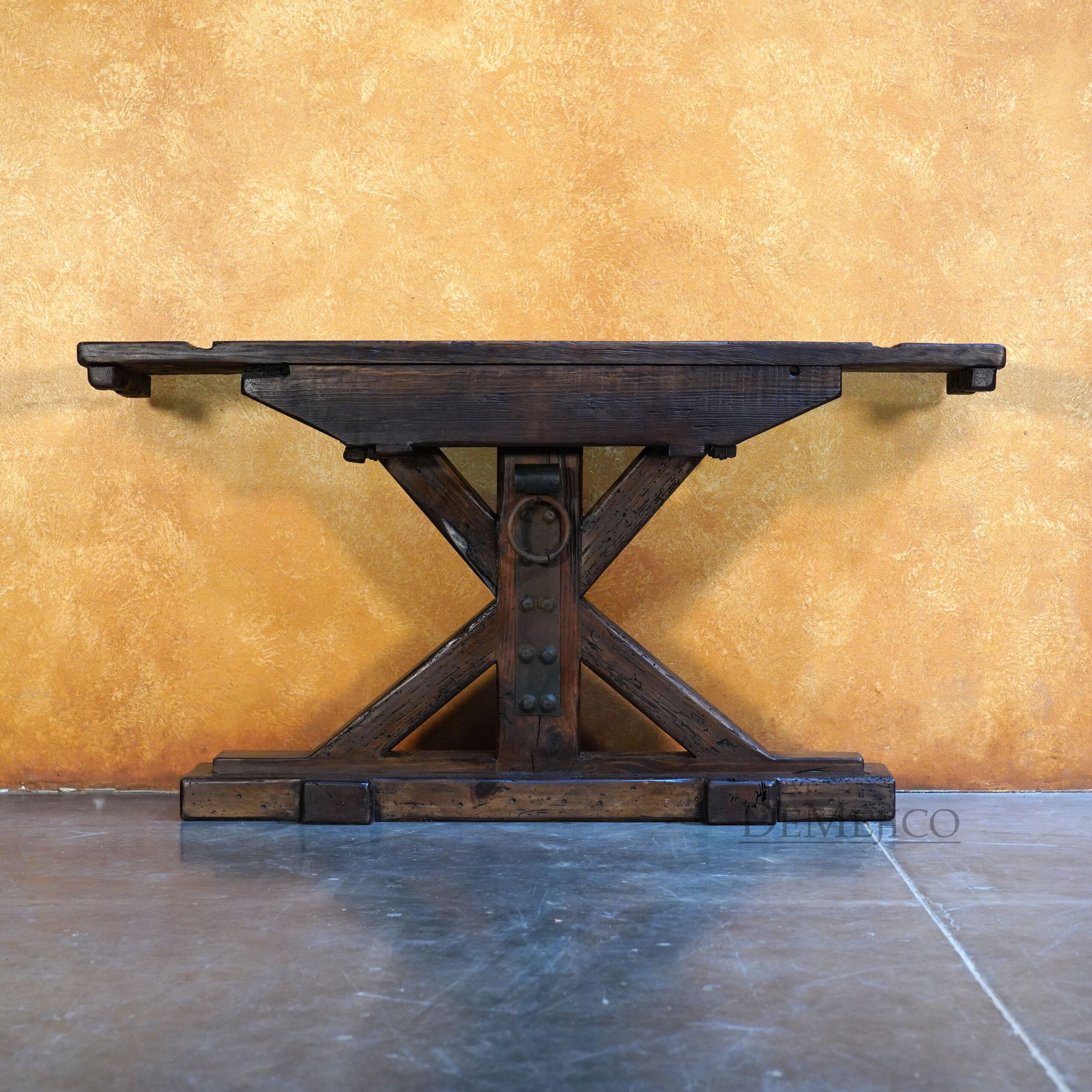 The Reclaimed Rustic Barn Console is made from reclaimed wood and solid lumber beams, with a touch of Farmhouse Style. Showcasing all of the natural knots, stretches, and imperfections of the wood, the top of this rustic console table is an original lumber piece, with inset grooves and beautiful color variations. Under this thick top, the wood legs have been placed in an X-shape, really enhancing the mix of styles for this Spanish Farmhouse Console Table. Finishing off this Farmhouse Console Table, a single hand forged iron plate and accent ring have been added in the center of the legs. Guaranteed to grab the attention of your guests, this rustic wood console table will fit into any Old World Spanish, rustic or farmhouse styled home.