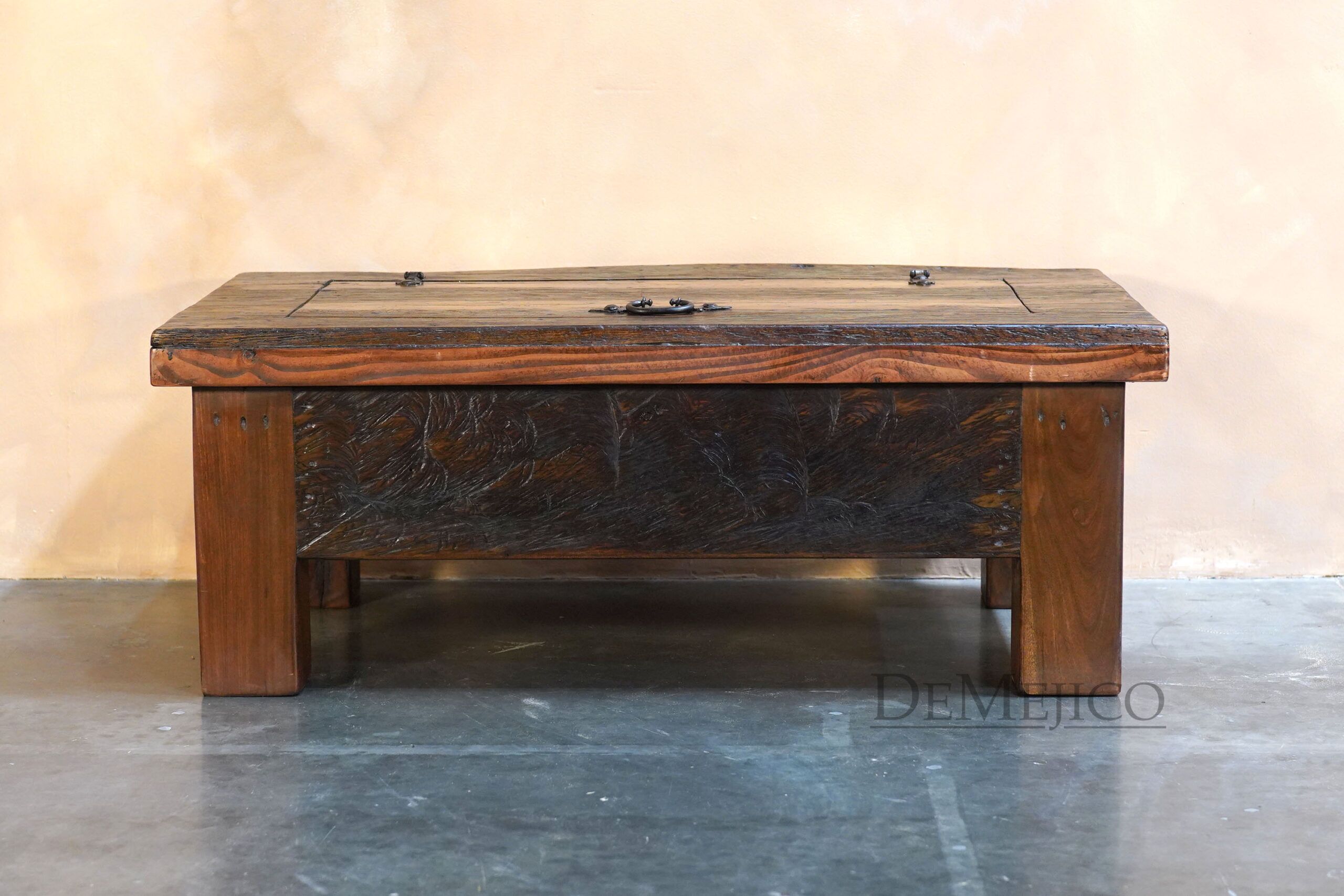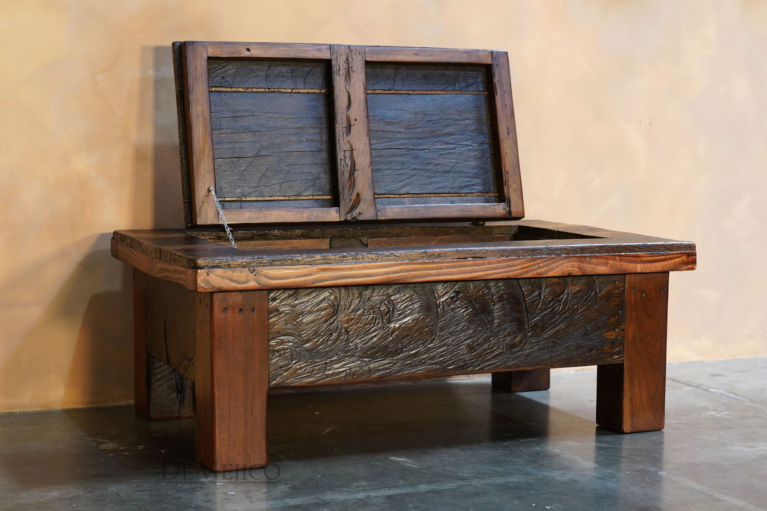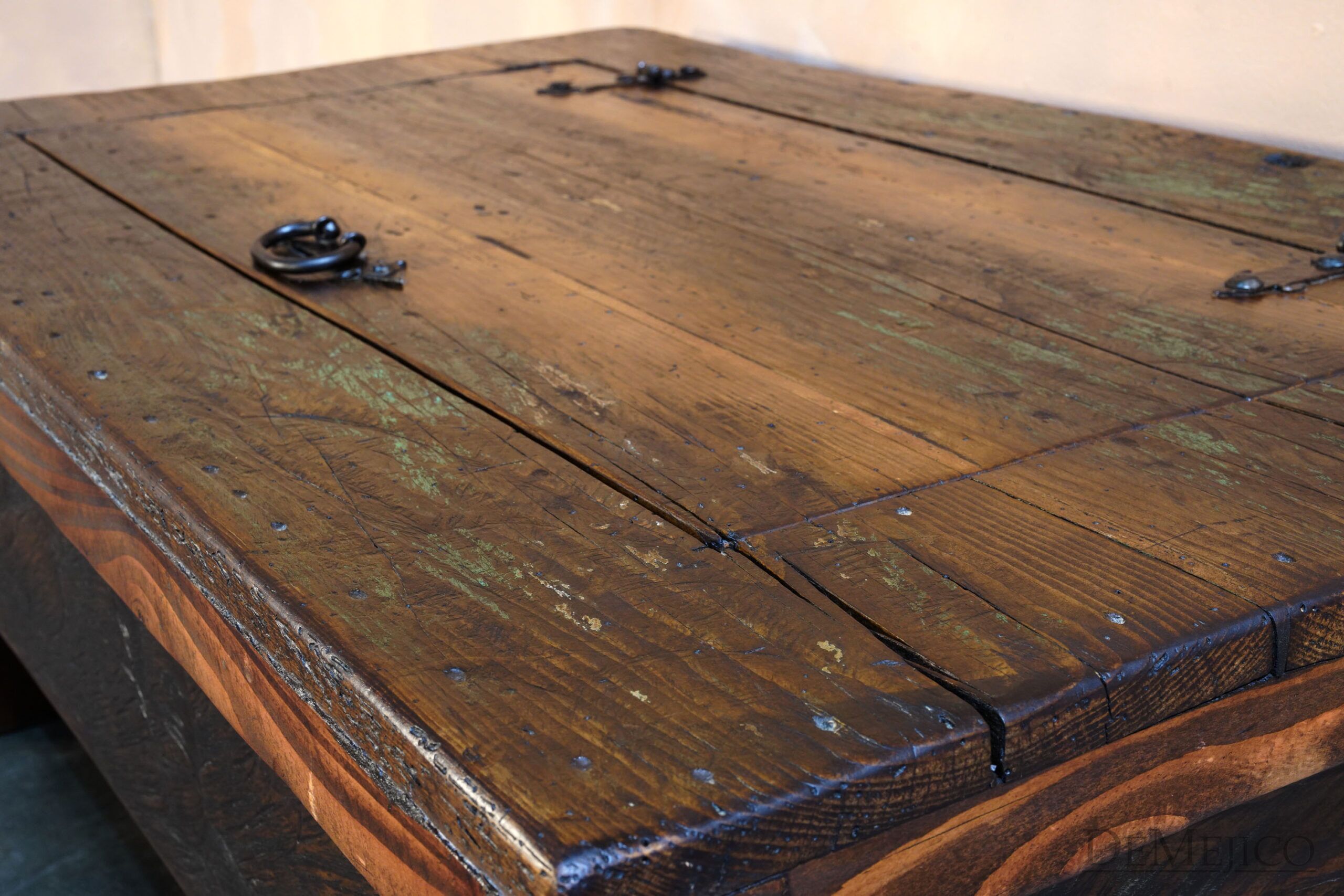 Featured in our Living Room Catalog, the Rustic Storage Coffee Table is a bold and eye-catching coffee table, fit for any rustic style space. Serving as the most unique part, the top of this old wood coffee table features a reclaimed door, with hand forged iron hinges and pulls, that pulls up for extra storage space. The rest of the coffee table is made from solid old wood, which beautifully showcases natural knots and stretches.
