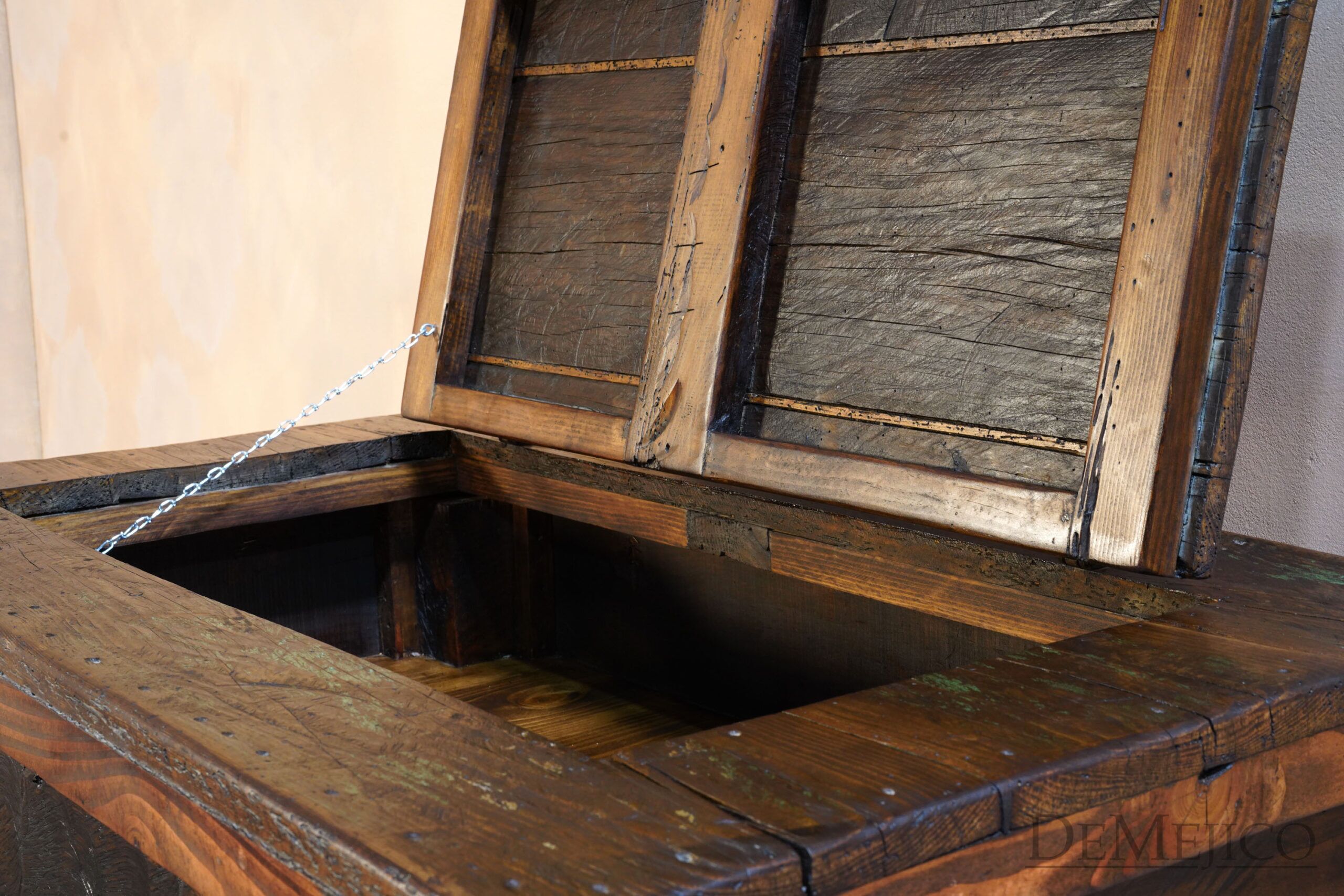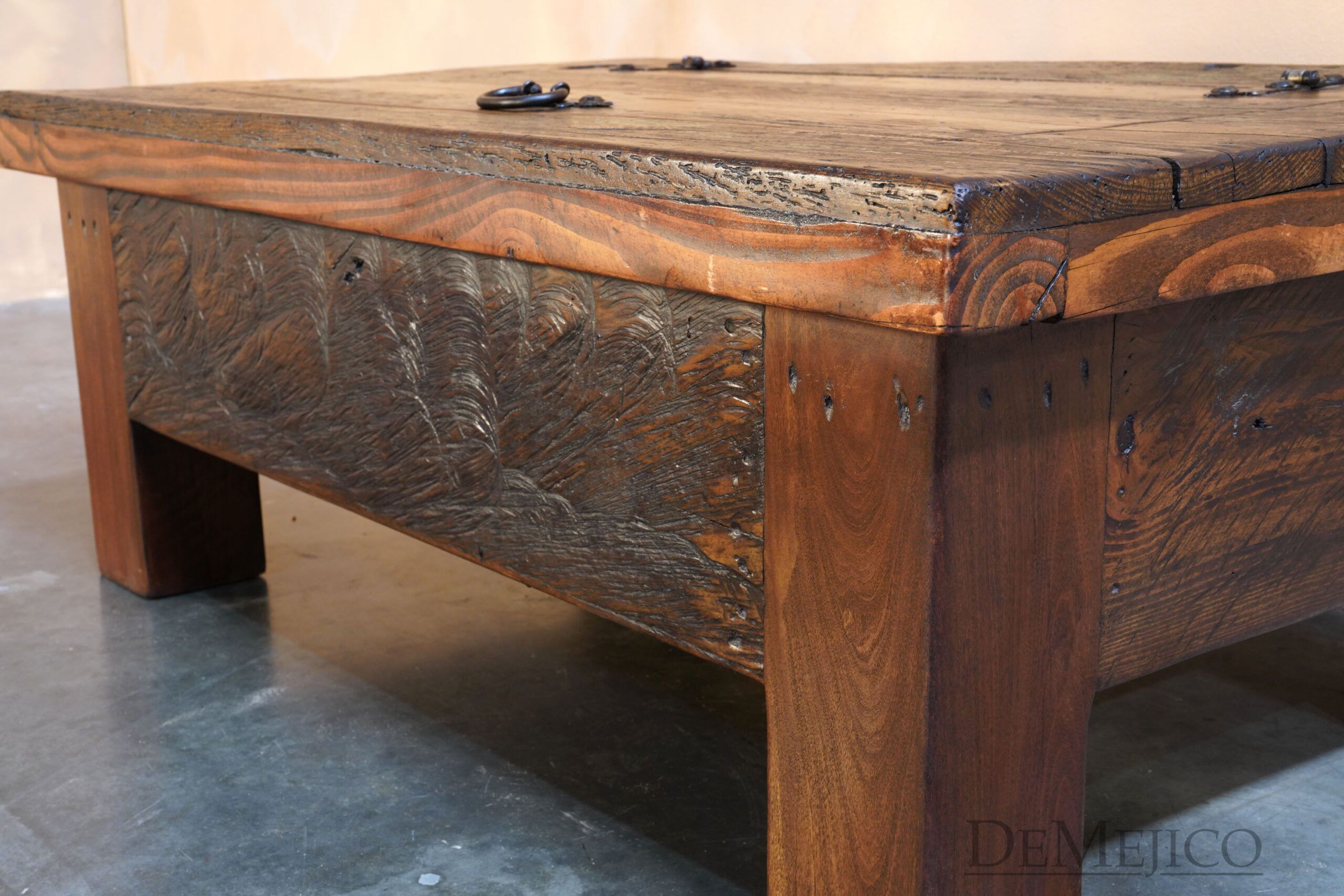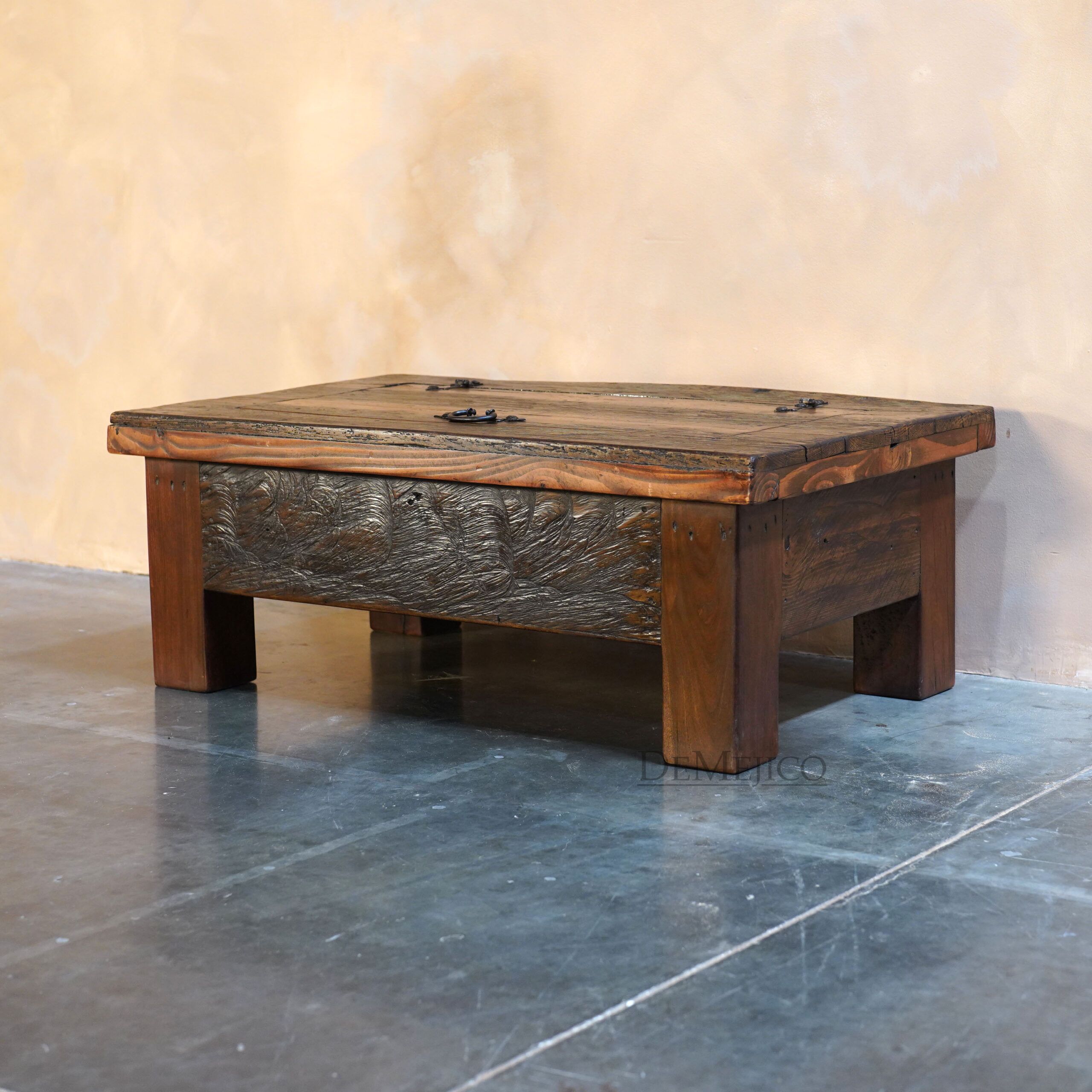 Featured in our Living Room Catalog, the Rustic Storage Coffee Table is a bold and eye-catching coffee table, fit for any rustic style space. Serving as the most unique part, the top of this old wood coffee table features a reclaimed door, with hand forged iron hinges and pulls, that pulls up for extra storage space. The rest of the coffee table is made from solid old wood, which beautifully showcases natural knots and stretches.