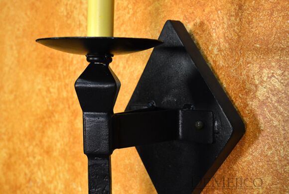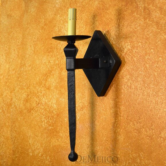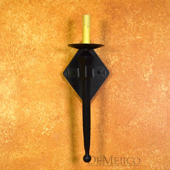The Siena Sconce is a simple, single candle, Spanish wall sconce, with Medieval Style flair. Sitting on a diamond shaped backplate, this sconce features geometric touches from top to bottom. Fit for any Medieval or Old World style home, this Medieval Wall Sconce will set the tone for that classic look in any interior space.