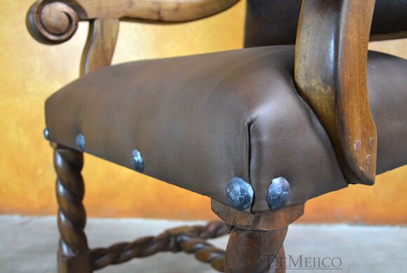 Our Silla Chapital with Arms chairs are one of our most popular chairs to date. Handcrafted from solid mesquite wood, these Spanish dining chairs feature a hand-tooled leather backrest, paired with a smooth leather seat, both comfortable and stylish. With turned legs, also hand carved, the Silla Chapital chairs really enhance Spanish style. With both form and function, these Hand Carved Spanish Chairs pair well in any dining space that wants a touch of Spanish flair.